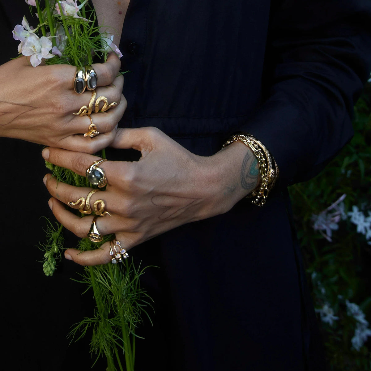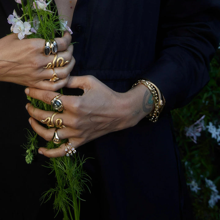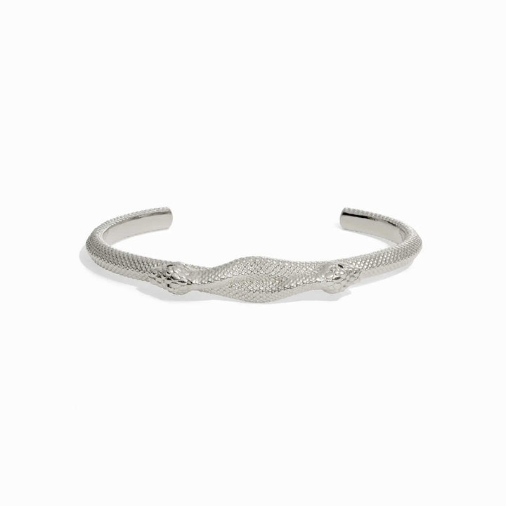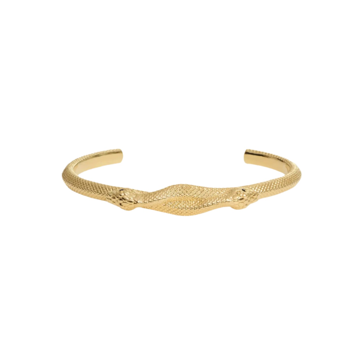 This Snake Cuff by Awe Inspired is a dramatic yet lightweight statement piece. Featuring two intertwined snakes with black enamel eyes, this cuff represents the cyclical nature of life, offering protection and wisdom to the wearer.