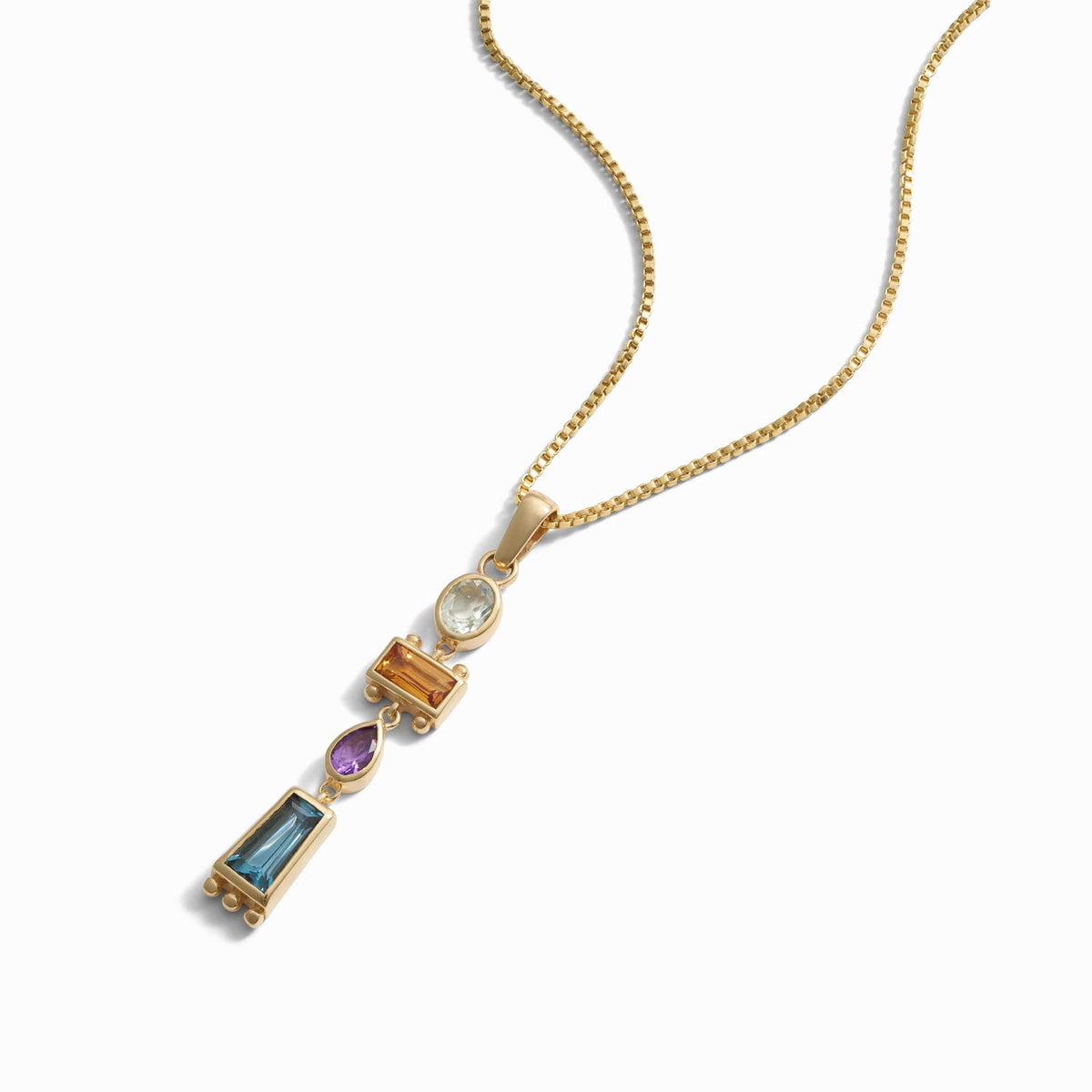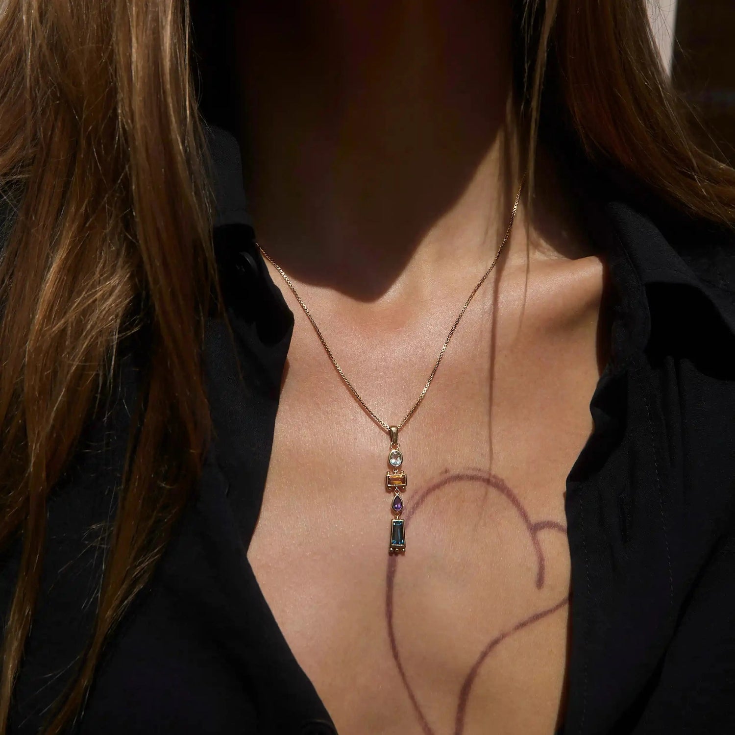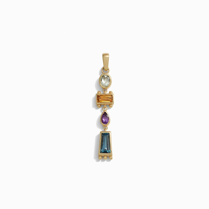 This Earth Goddess Talisman Amulet by Awe Inspired is a boho-inspired amulet featuring green amethyst, citrine, purple amethyst, and London blue topaz. With a vibrant color story, this piece is grounded in the beauty of nature and pairs well with Earth and Fire zodiac signs.
