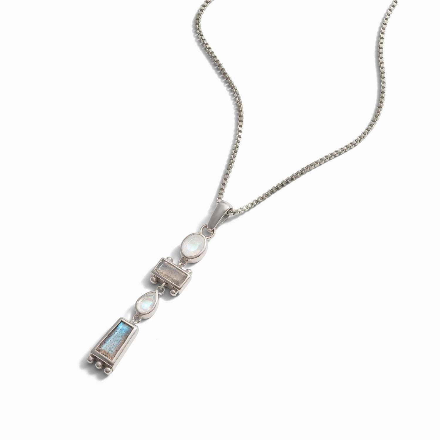This Earth Goddess Talisman Necklace by Awe Inspired in Sterling Silver features rainbow moonstone and labradorite in a color story inspired by mountain mists and glacial streams. Perfect for Air and Water zodiac signs, this necklace is grounded in nature’s beauty.