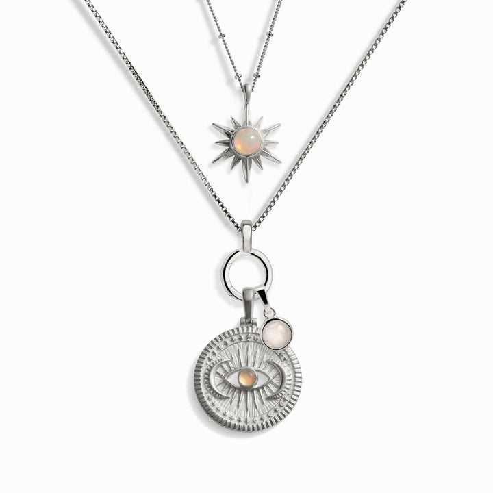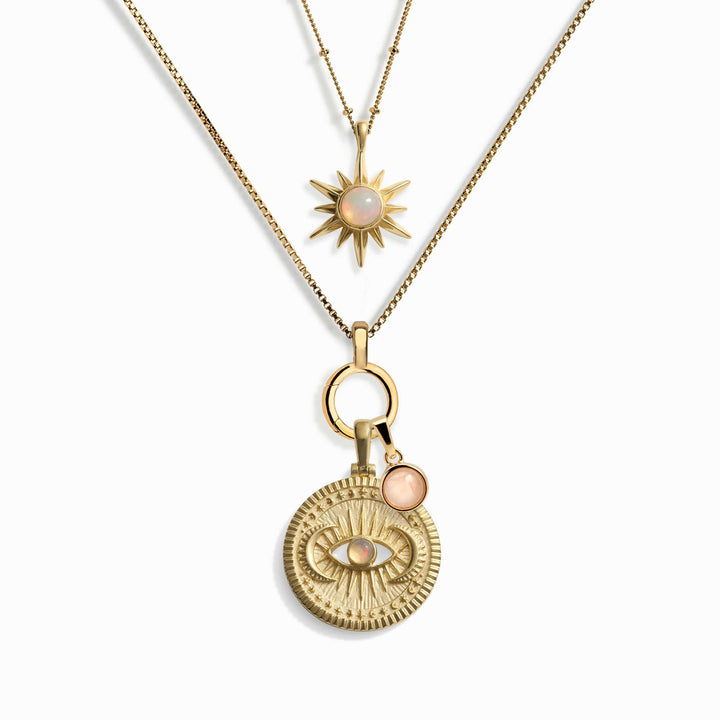 This Eye On the Sky Necklace Set by Awe Inspired is perfect for stargazers, with iridescent moonstone and white opal dancing between the Opal Sun and Cosmic Eye amulets. This cosmic-inspired set captures the mystery and beauty of the heavens.