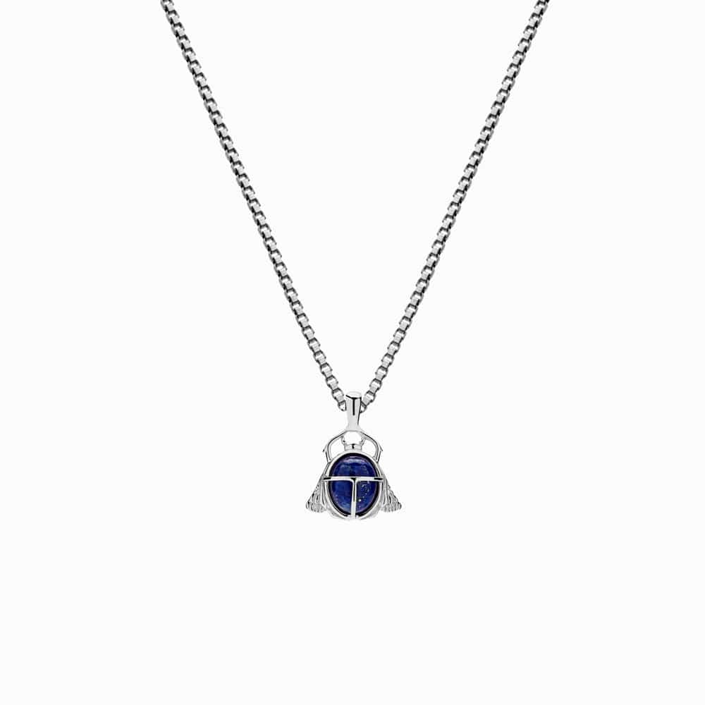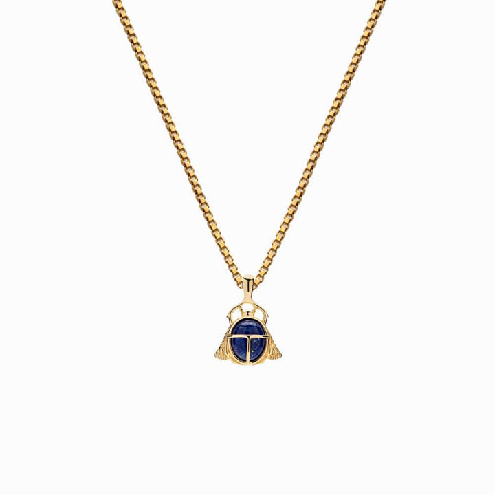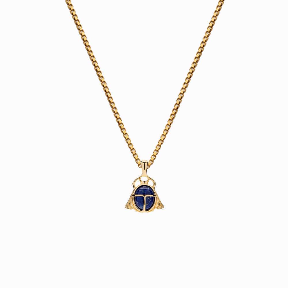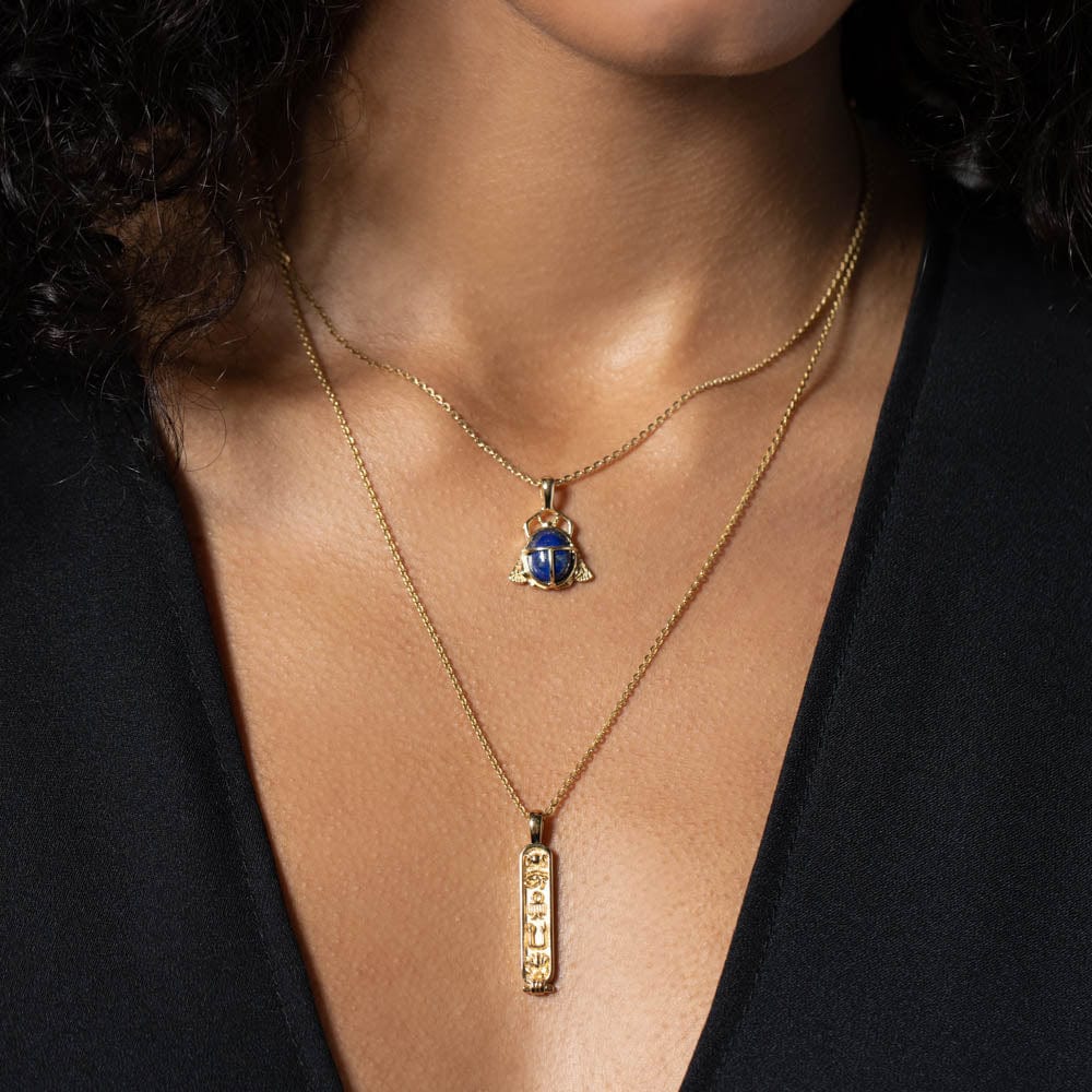 This Lapis Lazuli Scarab Necklace by Awe Inspired symbolizes protection and the cycle of life, modeled after the ancient Egyptian scarab beetle. With lapis lazuli representing power and wisdom, this amulet serves as a reminder of life’s beauty and protection.
