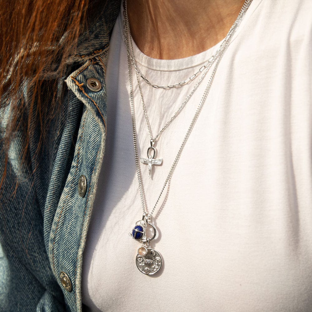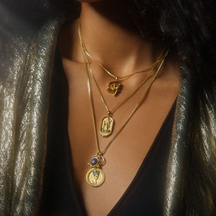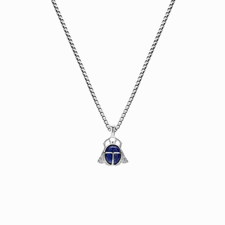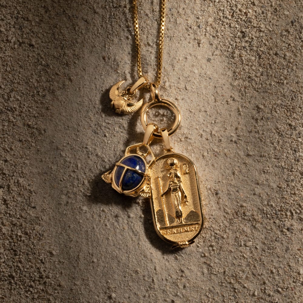 This Lapis Lazuli Scarab Necklace by Awe Inspired symbolizes protection and the cycle of life, modeled after the ancient Egyptian scarab beetle. With lapis lazuli representing power and wisdom, this amulet serves as a reminder of life’s beauty and protection.