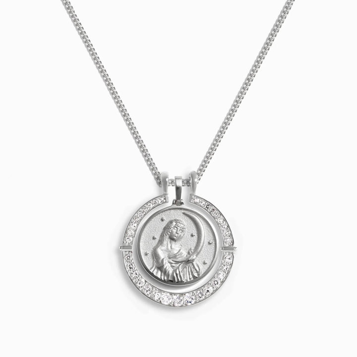 This White Topaz Selene Halo Necklace Set by Awe Inspired radiates celestial beauty, featuring the moon Goddess Selene crowned with a halo of white topaz. This set captures the pure radiance of the full moon, magnified by the cleansing energy of white topaz.