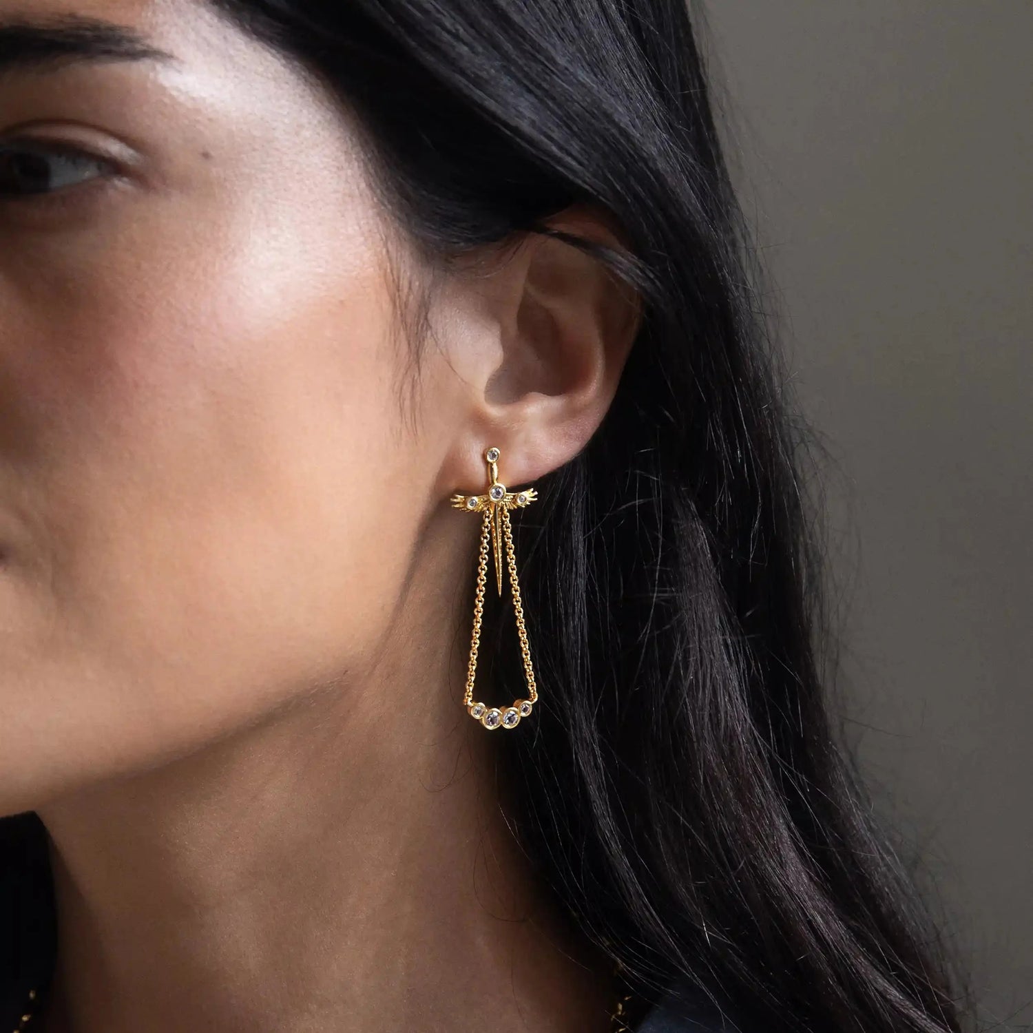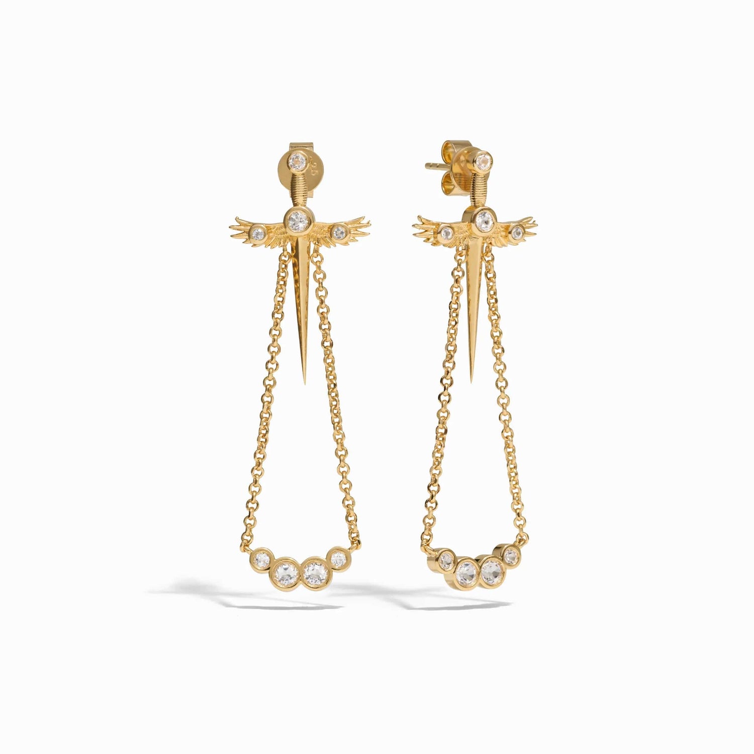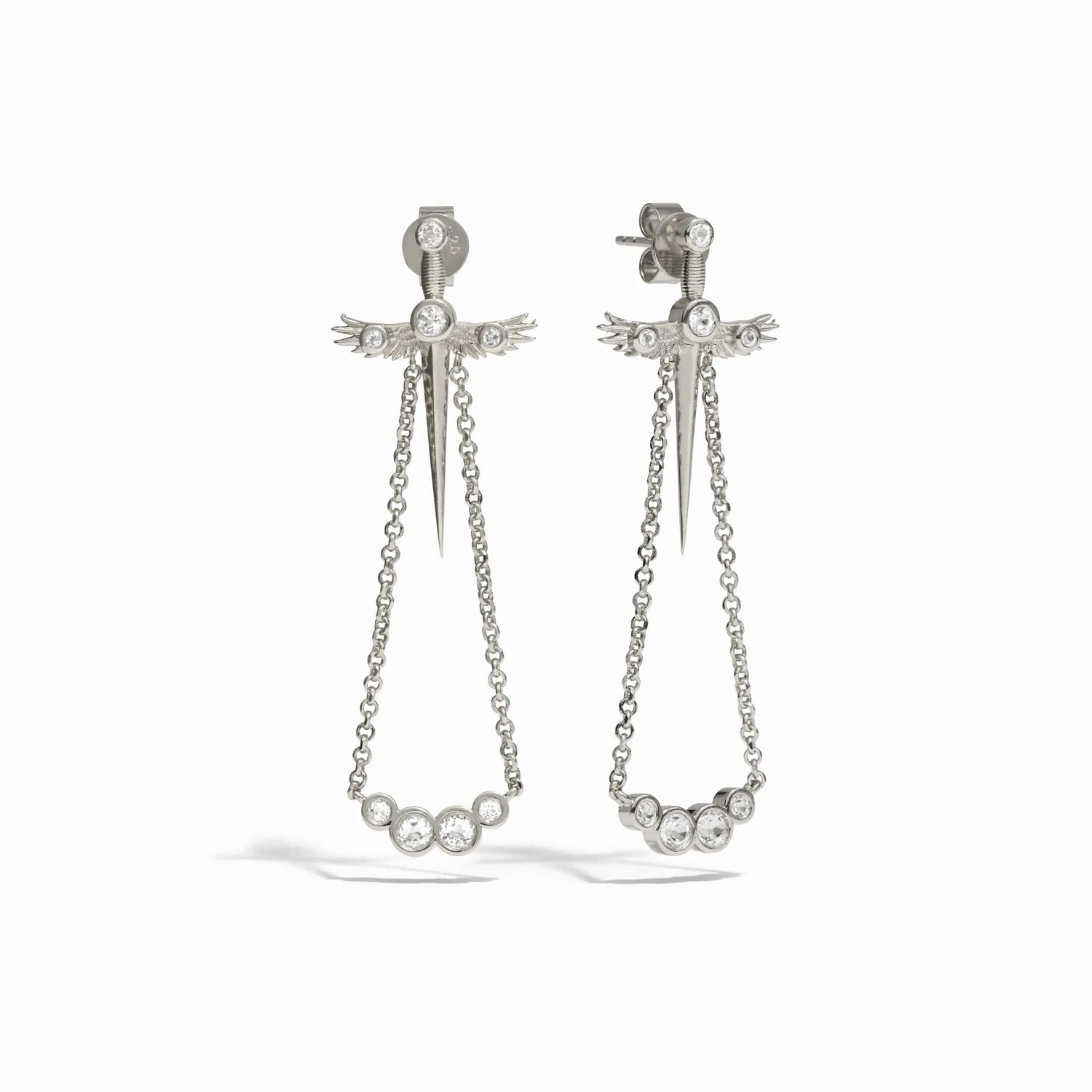 These Winged Sword Drop Earrings by Awe Inspired feature Athena’s owl wing sword, symbolizing the balance of wisdom and courage. With drop chains and white topaz accents, these earrings are a bold and powerful accessory that reminds the wearer of Athena’s strength and wisdom.