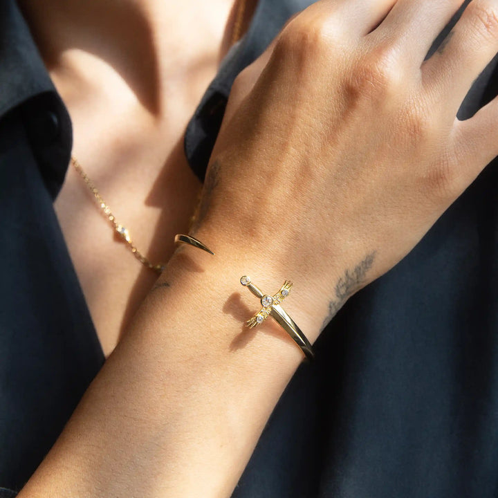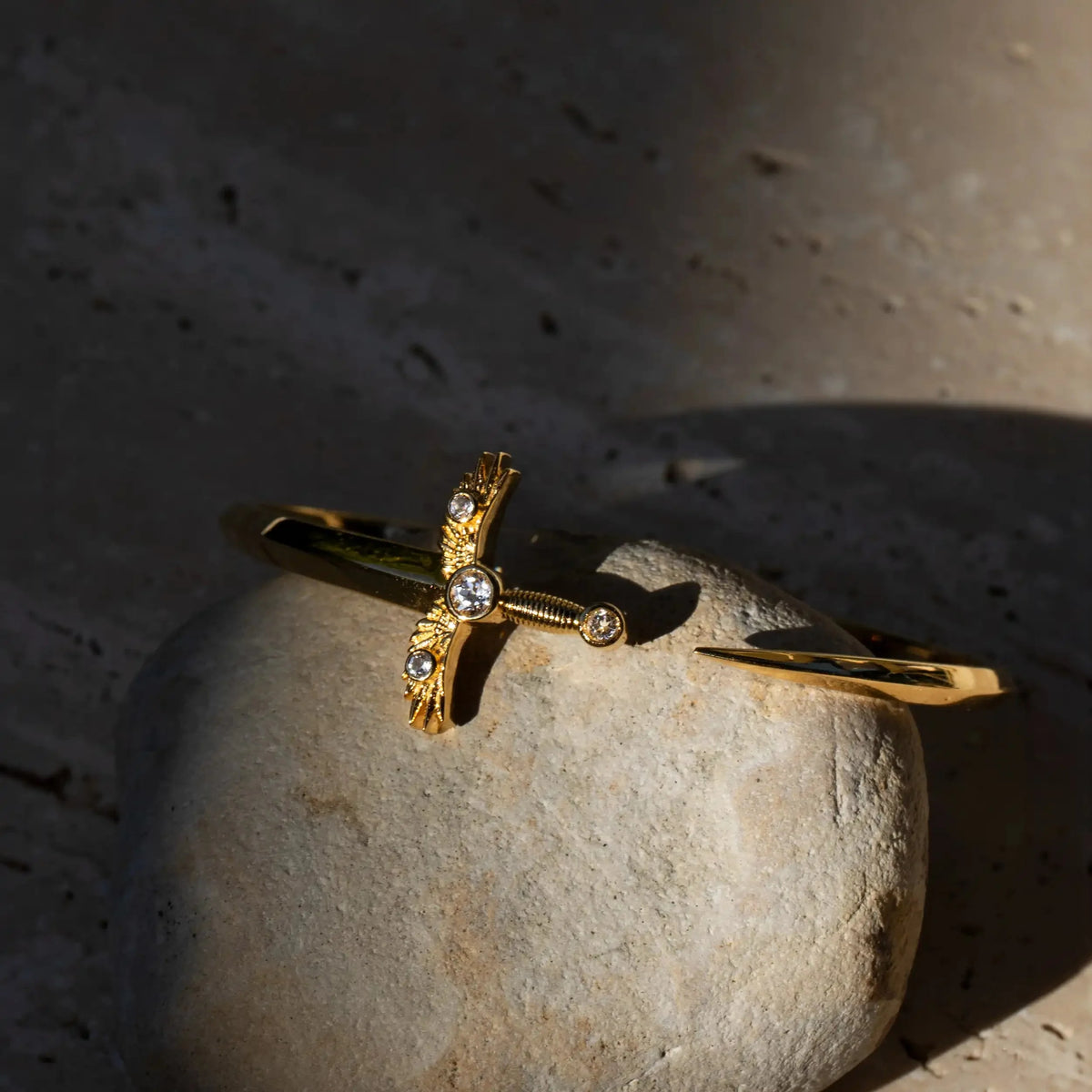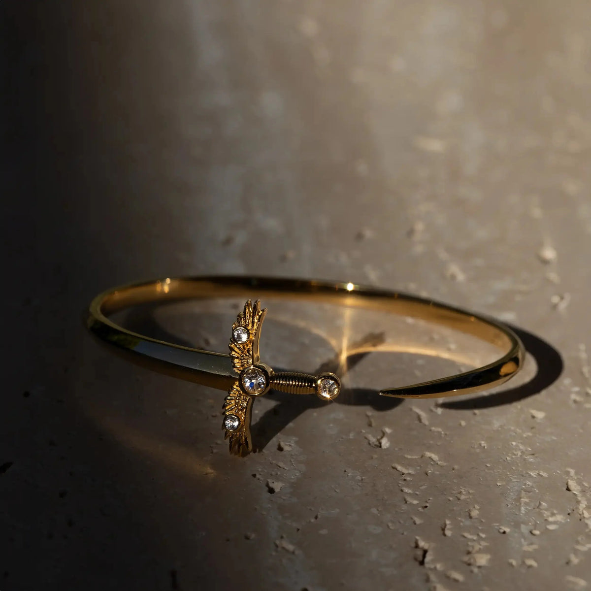 This Winged Sword Cuff by Awe Inspired is a statement bracelet that wraps around the wrist with Athena’s owl wing sword. The open-top design and white topaz accents make this cuff a powerful talisman of Athena’s wisdom and strength, symbolizing the perfect balance of wit and courage.