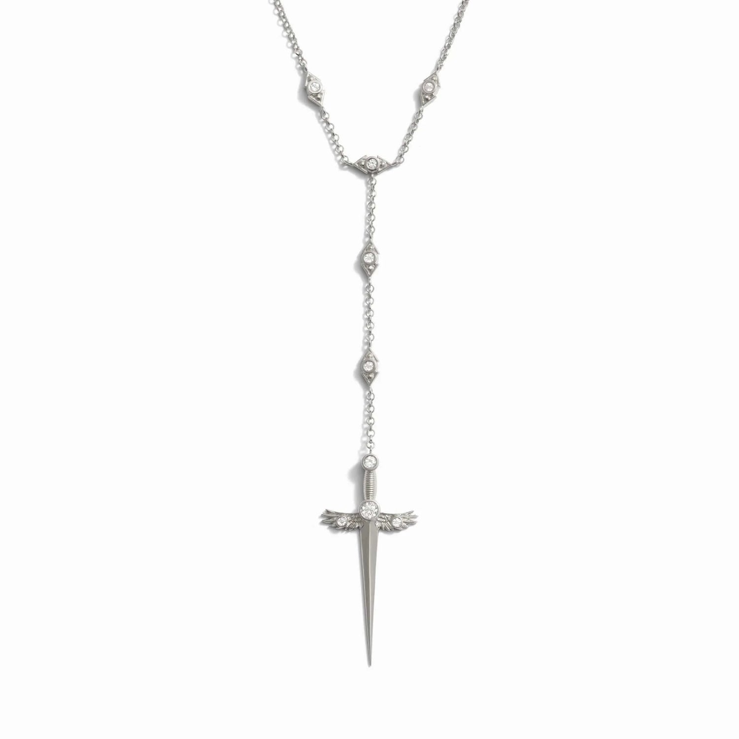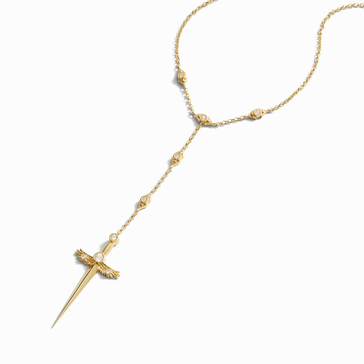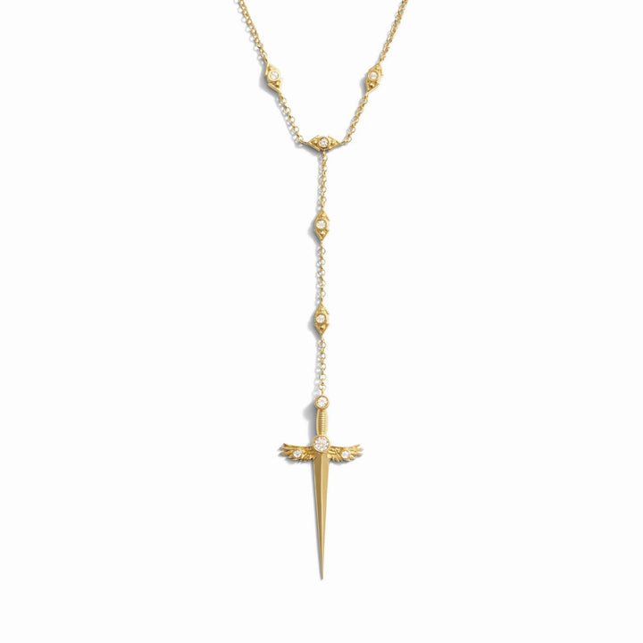 This Winged Sword Lariat by Awe Inspired highlights Athena’s owl wing sword, with white topaz stations adding sparkle to the lariat chain. This striking piece serves as a talisman of Athena’s power and a reminder of your inner wisdom and imminent victory.