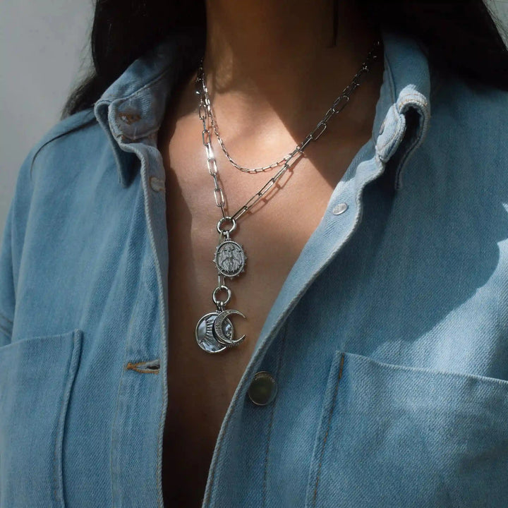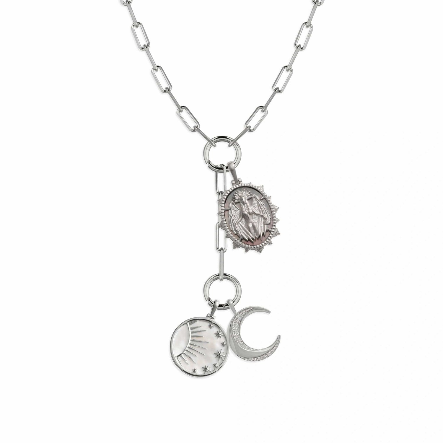 This Lilith Moon Charm Lariat by Awe Inspired celebrates the dark side of the moon, ruled by Lilith. This sterling silver lariat necklace embraces the mysterious and dark aspects of femininity, offering a bold statement for those who dare to explore their shadow side.
