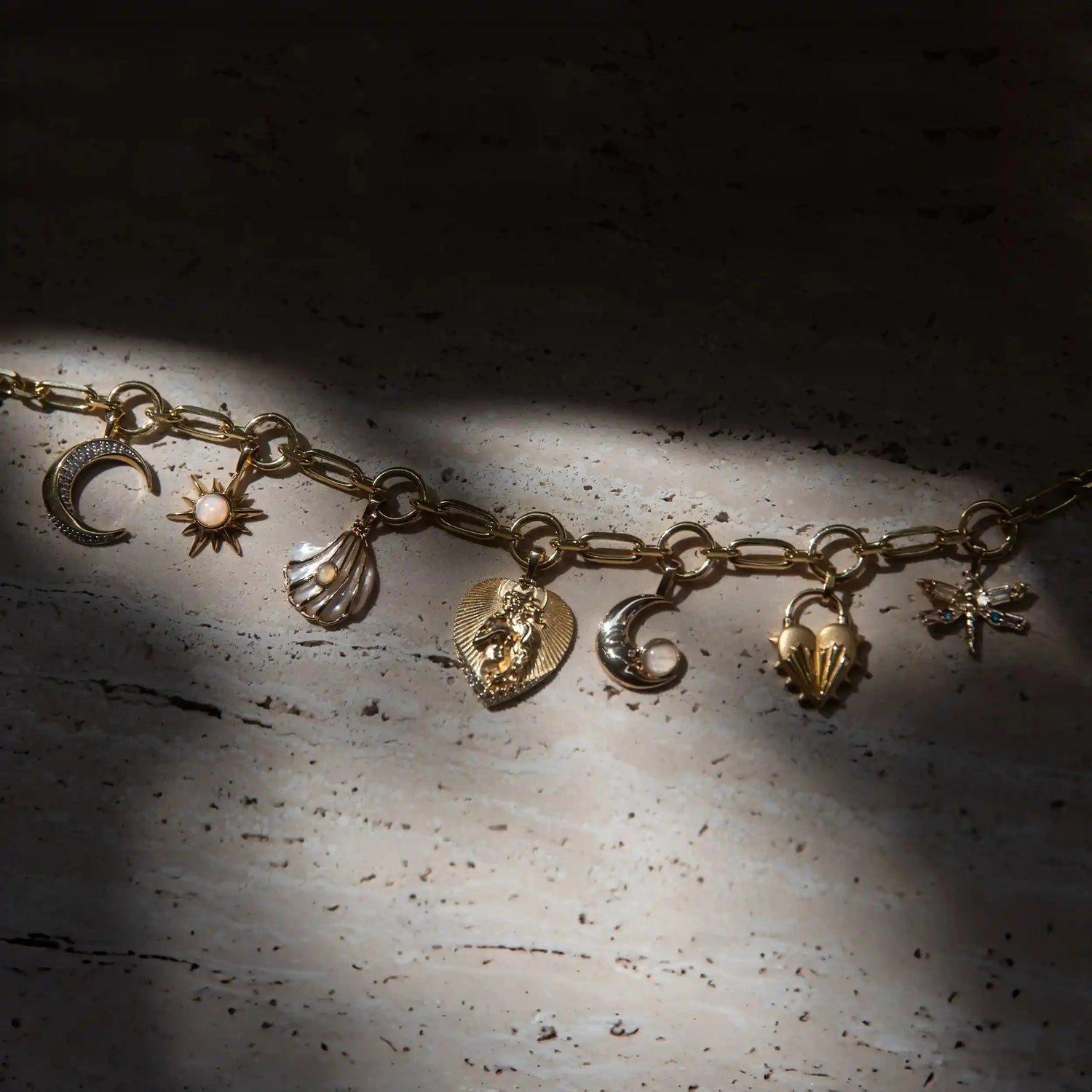 Handcrafted in 14K yellow gold vermeil, featuring charms like the Twisted Moon, Opal Sun, MOP Carved Shell, and Lucky Dragonfly.