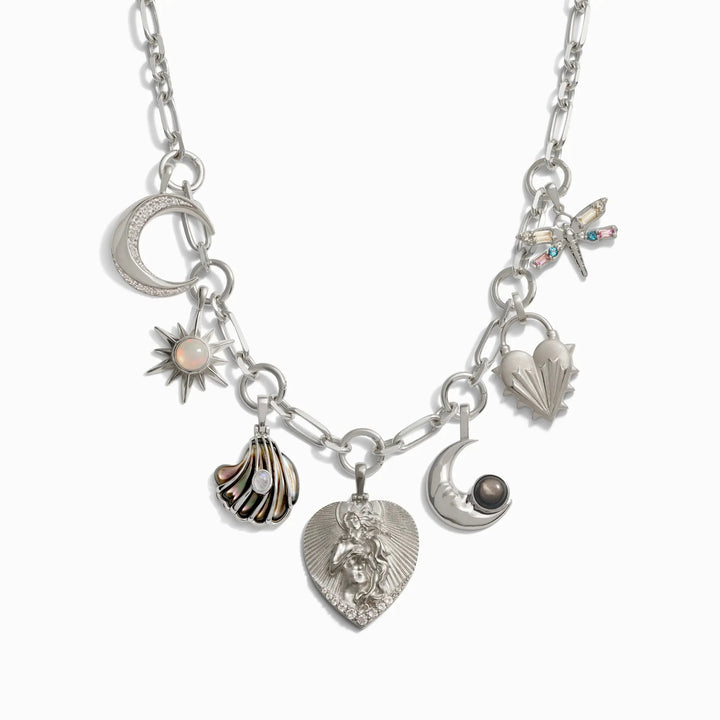 This Special Edition Aphrodite Charm Necklace by Awe Inspired is a celebration of love, beauty, and confidence. Featuring a collection of stunning charms including the Twisted Moon, Opal Sun, MOP Carved Shell, and more, this necklace brings out your inner goddess. The Statement Charm Collector Necklace allows for customization and creativity, giving you the freedom to switch and add charms as you desire.