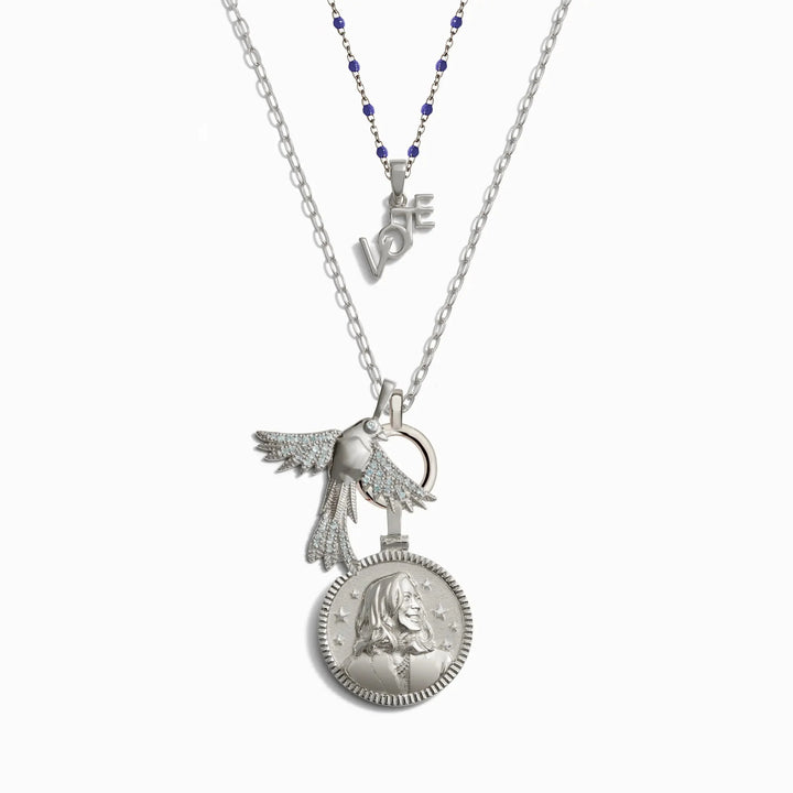 Reach New Heights Necklace Set: Take flight with this exclusive set featuring the Kamala Harris pendant and a suffragist Bluebird with blue topaz wings. A symbol of the fight for women’s rights, the Bluebird represents women’s voices being heard.