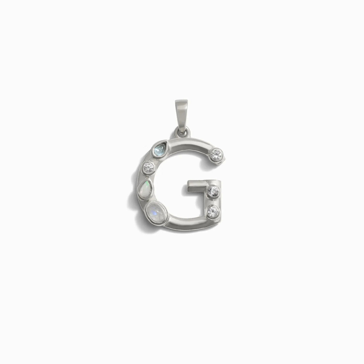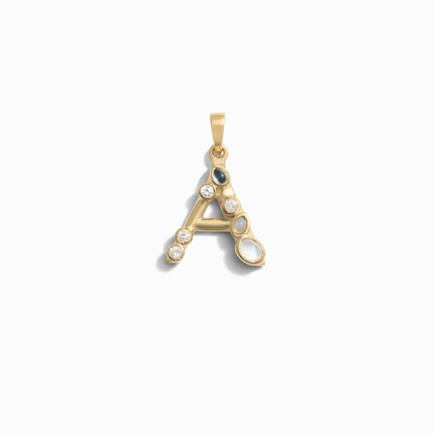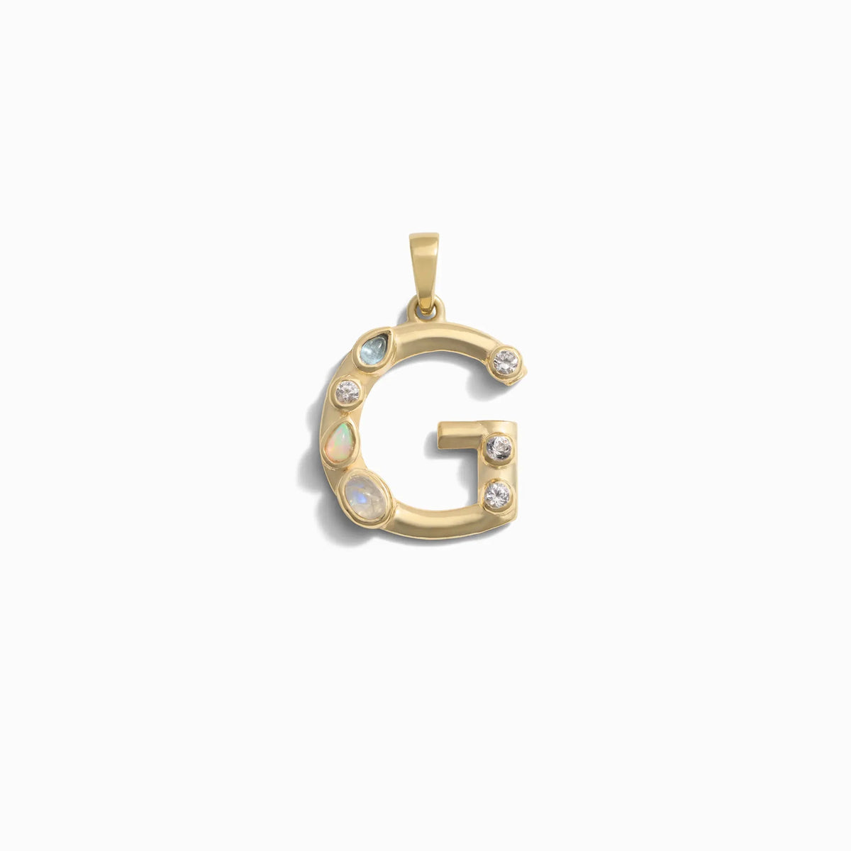 Handcrafted in 14K yellow gold vermeil with pear-cut moonstones, opal, and London blue topaz. Dimensions vary depending on the letter.