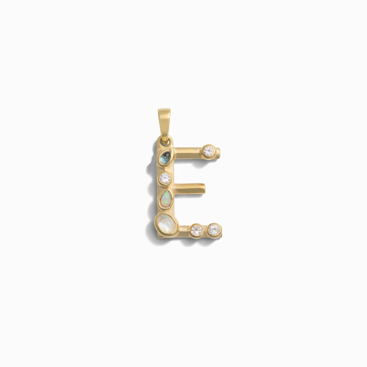 Handcrafted in 14K yellow gold vermeil with pear-cut moonstones, opal, and London blue topaz. Dimensions vary depending on the letter.