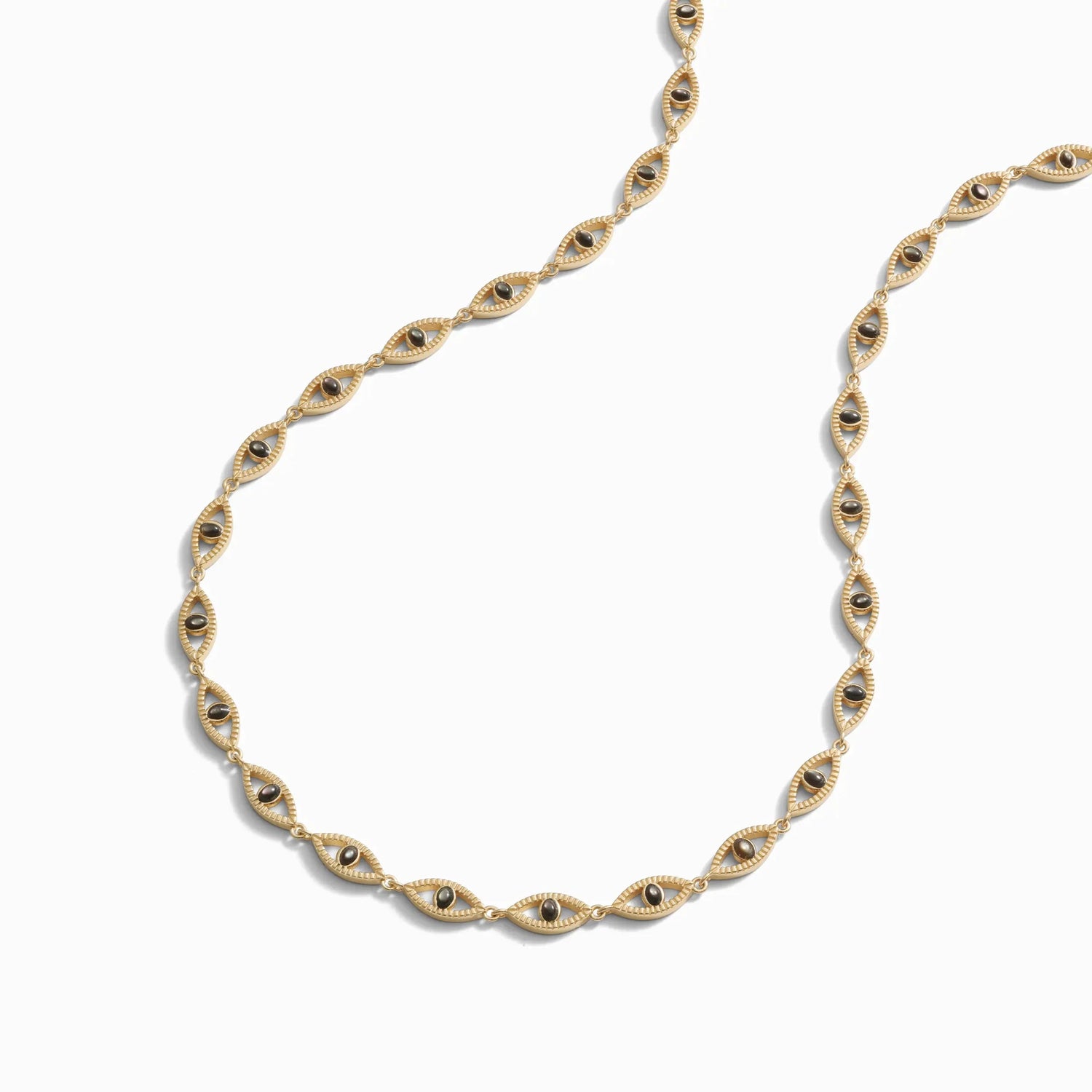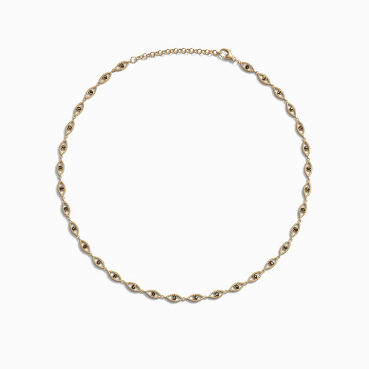 This Third Eye Tennis Necklace by Awe Inspired is designed to awaken your spiritual awareness. Featuring faceted coin edge eyes of black mother of pearl, this elegant piece also includes an extender for adjustable length.