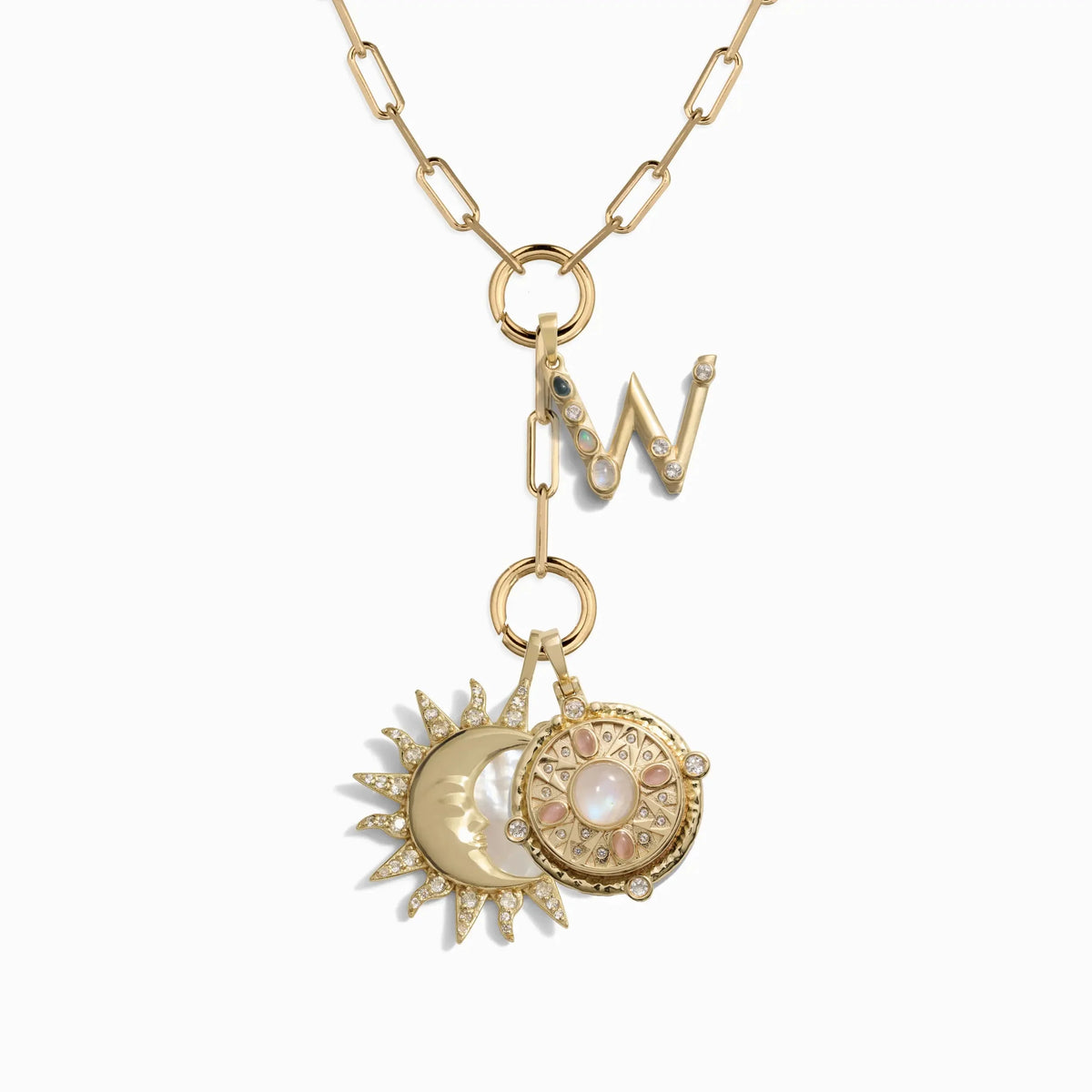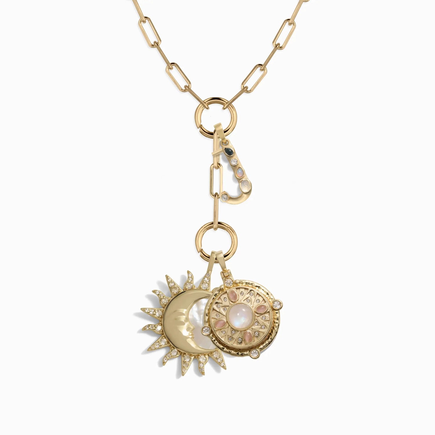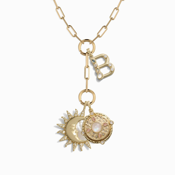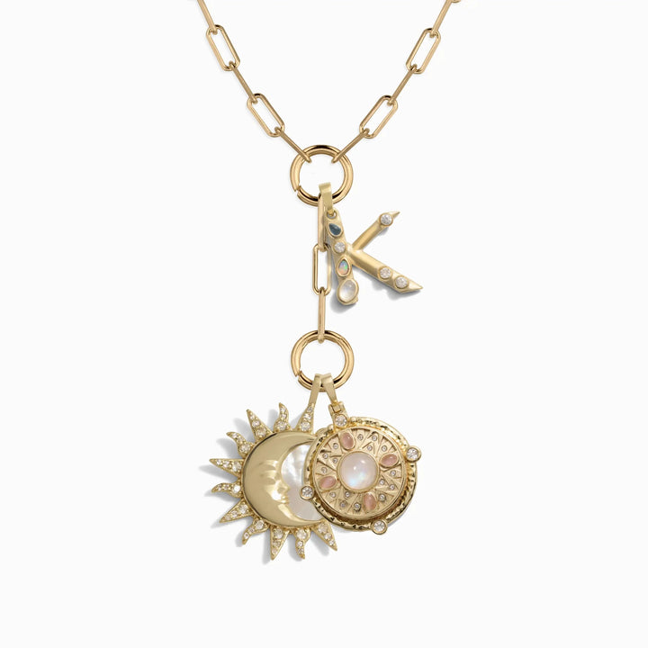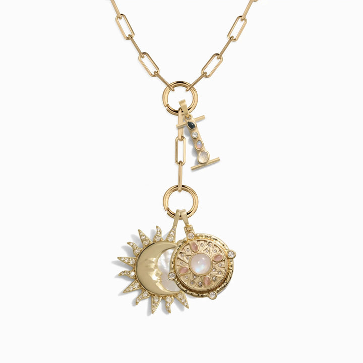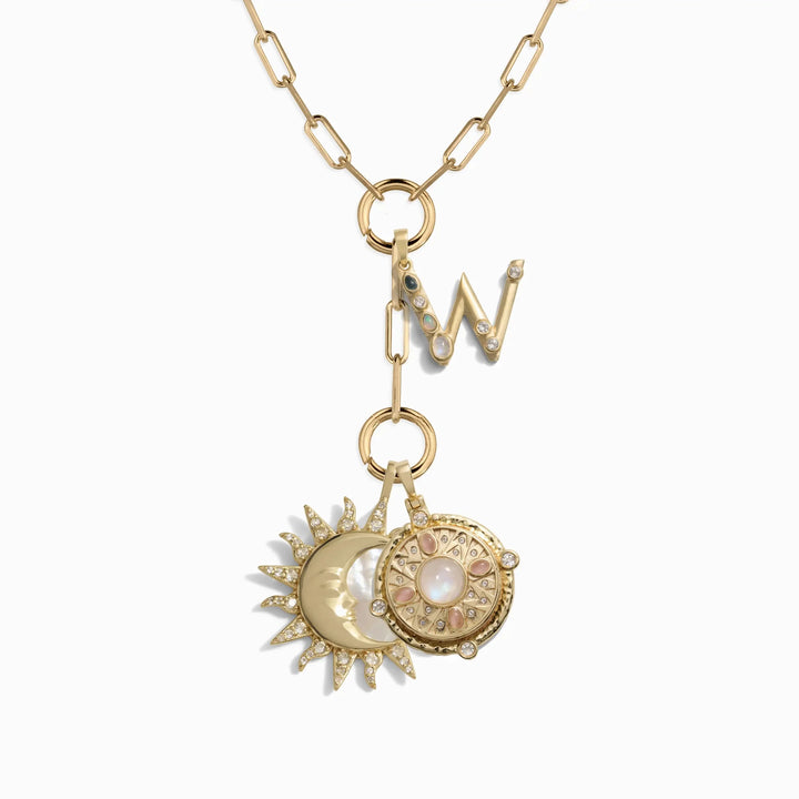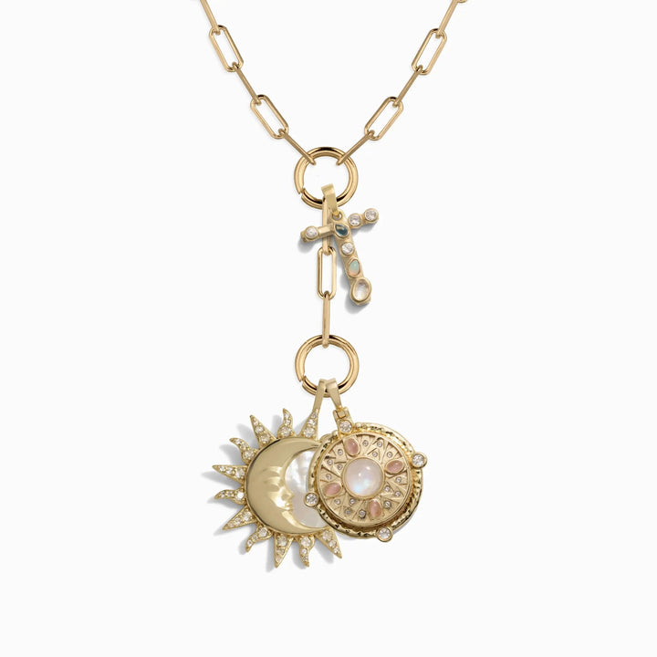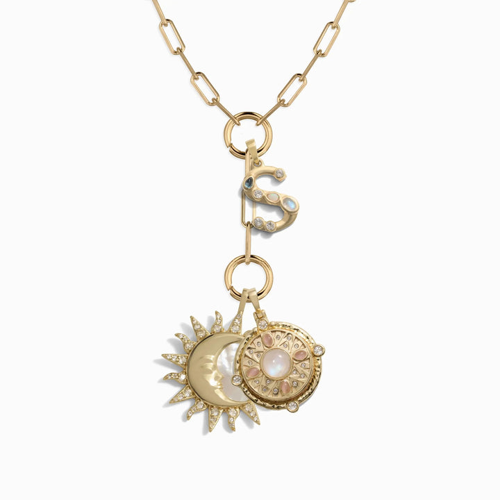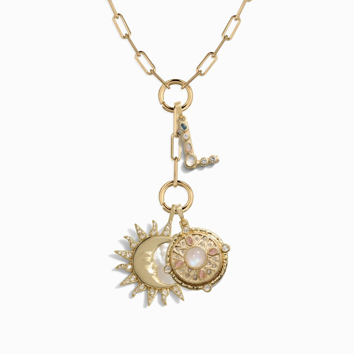 This Jill’s Charm Lariat by Awe Inspired is a symbolic and personal piece, featuring a manifestation locket alongside Sun & Moon Mother of Pearl and Astral Amulets. The locket holds your manifestations, while the charms add an extra layer of symbolism and protection.