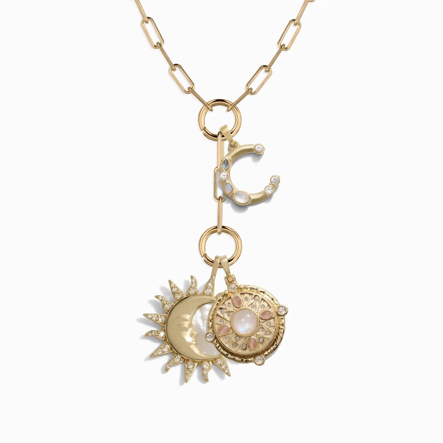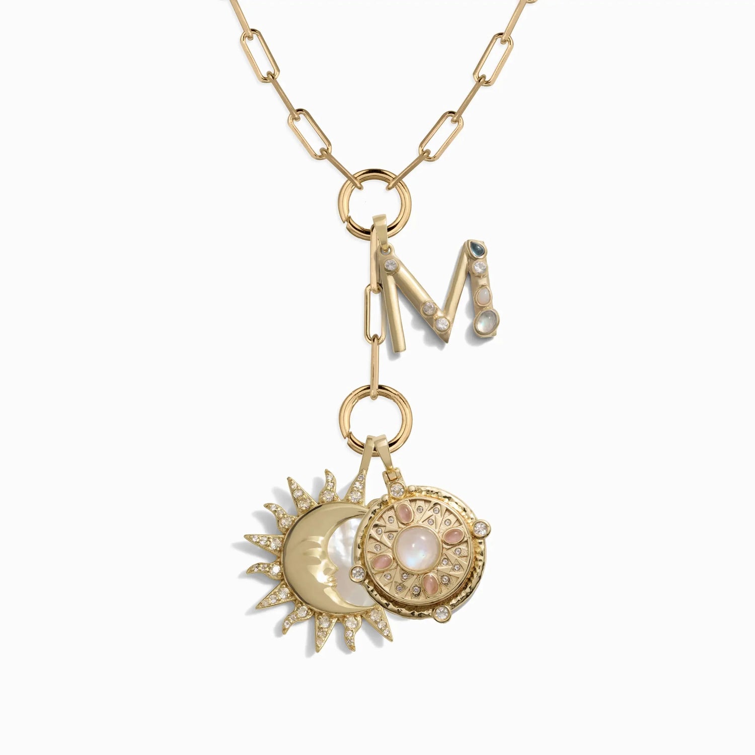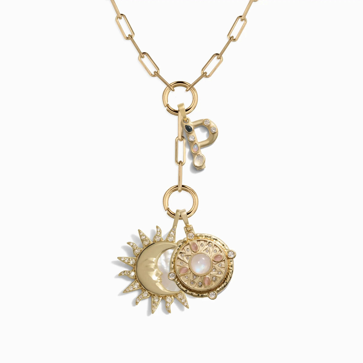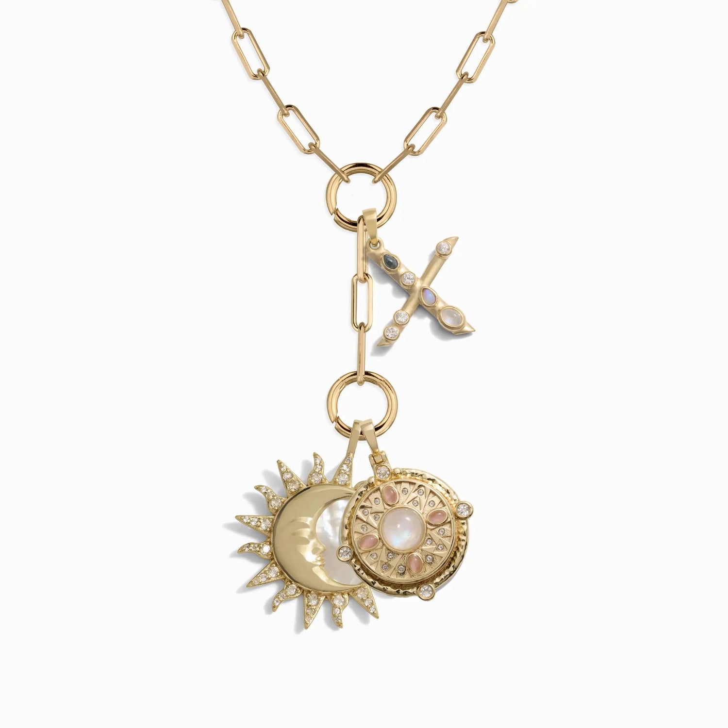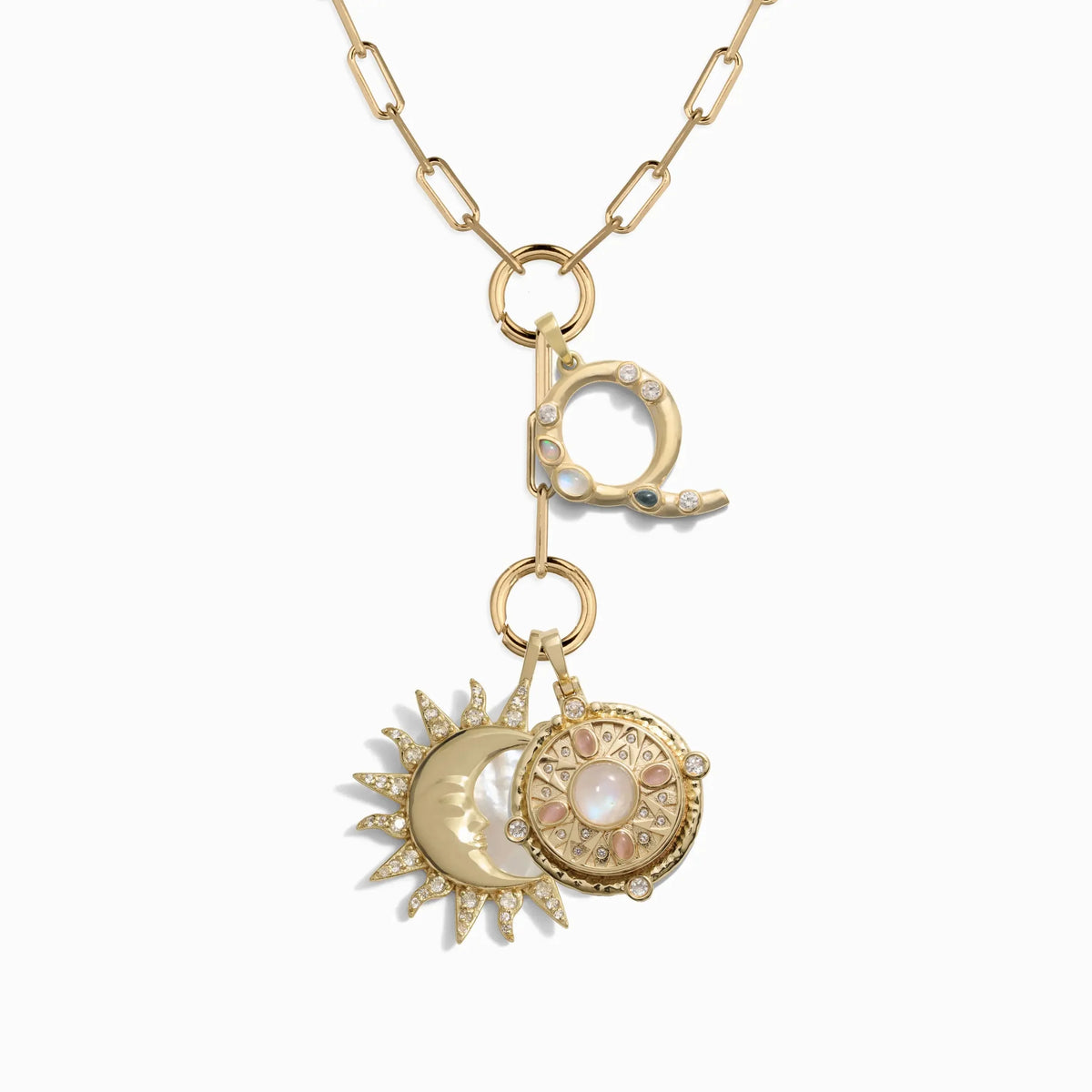 This Jill’s Charm Lariat by Awe Inspired is a symbolic and personal piece, featuring a manifestation locket alongside Sun & Moon Mother of Pearl and Astral Amulets. The locket holds your manifestations, while the charms add an extra layer of symbolism and protection.