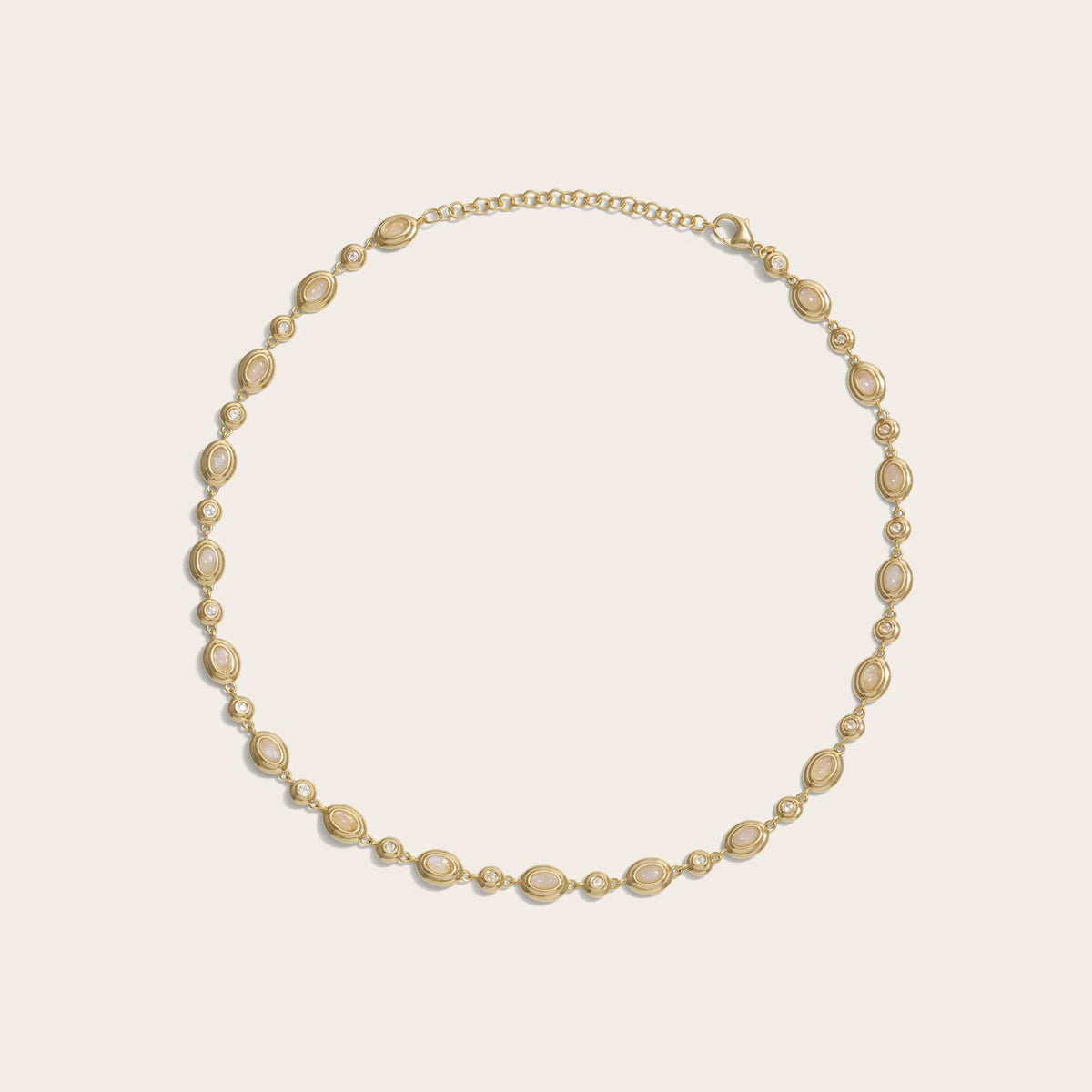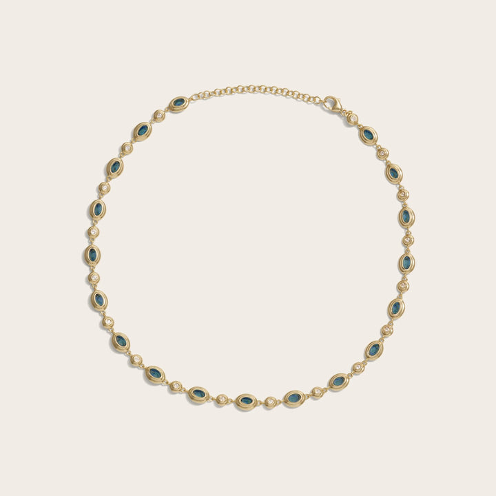 This necklace is made from 14k yellow gold vermeil and features white topaz and blue quartz gemstones. It has a width of 7mm and an adjustable length from 14" to 16". Due to the nature of genuine gemstones, variations in color may occur.