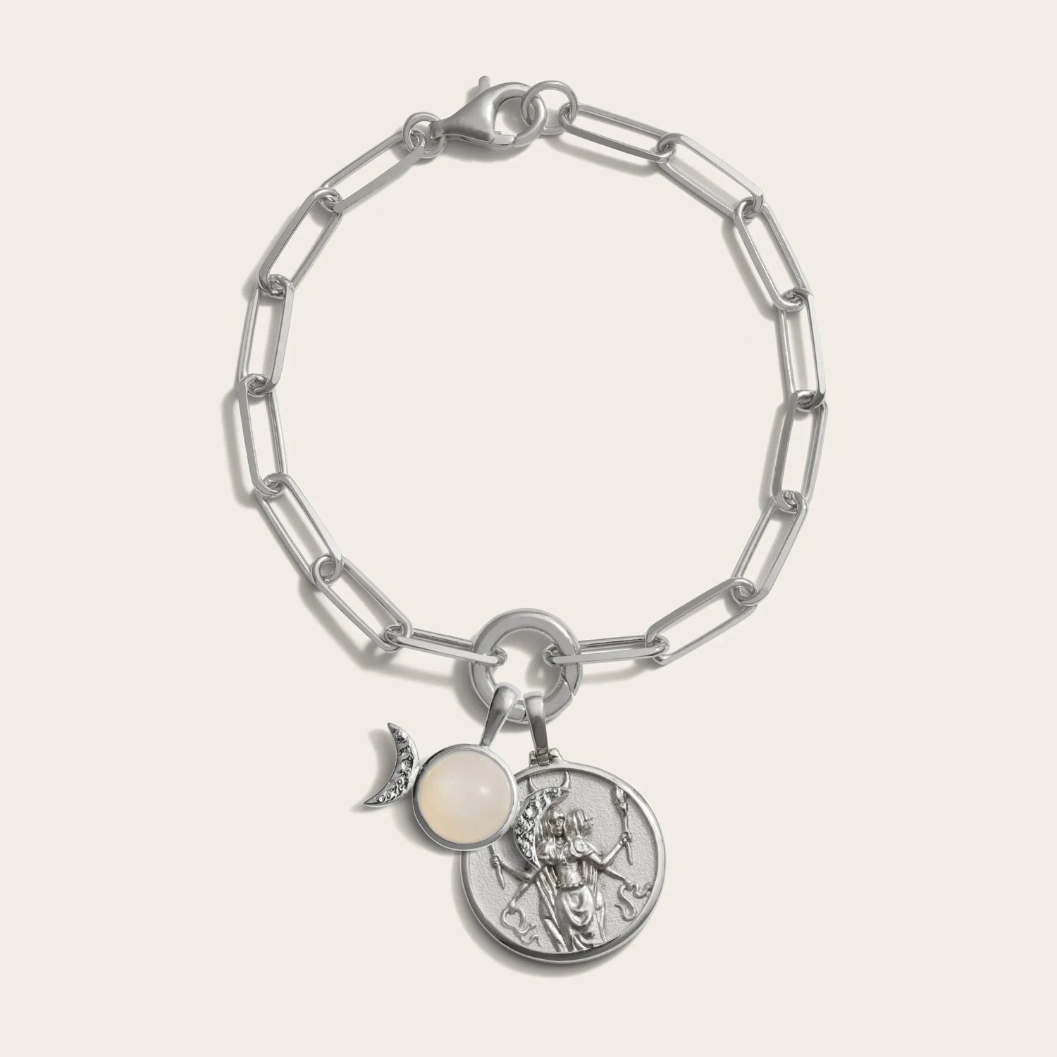 This Hecate Triple Moon Charm Bracelet by Awe Inspired is a mystical and enchanting accessory that channels the magic of Hecate, the Greek Goddess of witchcraft and the underworld. Known as the protector of transitions, she holds the keys to the afterlife and guides spirits. Paired with a Triple Moon Amulet, a symbol of the divine feminine's three stages (maiden, mother, crone), this bracelet is a powerful talisman for those who embrace transformation and mystique. It is a stunning piece that celebrates inner magic and unseen power.
