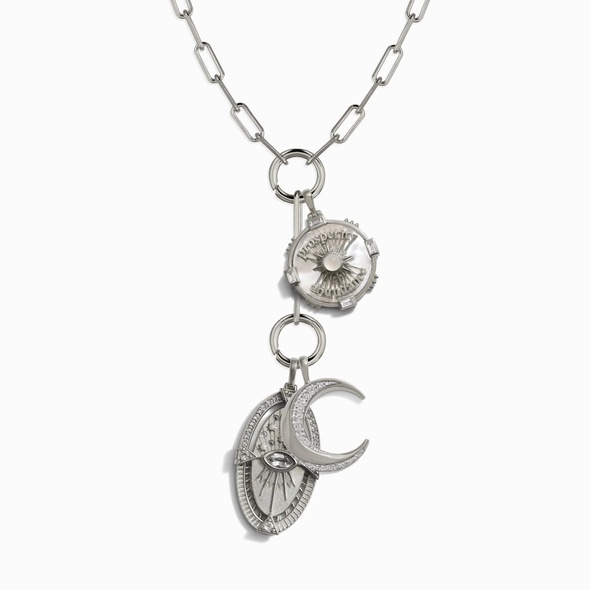 This Dream Locket Charm Lariat by Awe Inspired is a stunning and powerful collection designed to inspire transformation and opportunity. The set includes the white topaz Dream Locket, a talisman of clarity and manifestation, the Twisted Moon Amulet, symbolizing mystique and weight, and the Prosperity Affirmation Coin, which features moonstone for intuition and white topaz for abundance. This lariat, with its three powerful charms, is a perfect tool for turning your dreams into reality.
