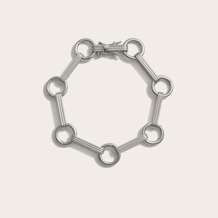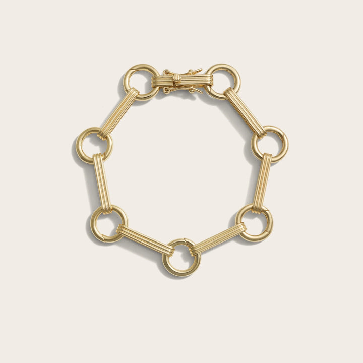 This bracelet is crafted from 14k yellow gold vermeil. It has a length of 6.95" and features seven charm links on a bar chain.