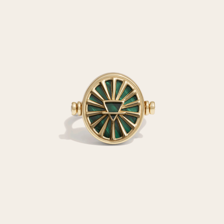 The Capricorn & Earth Flip Ring by Awe Inspired is a versatile and symbolic accessory for those who identify with the Capricorn zodiac sign or the earth element. This double-sided flip ring is hinged and fully dynamic, allowing you to wear it on either side. One side features a malachite inlay and the earth element symbol, while the other shows the white topaz Capricorn zodiac sign. It's a perfect piece to showcase your grounded, trustworthy, and balanced nature.