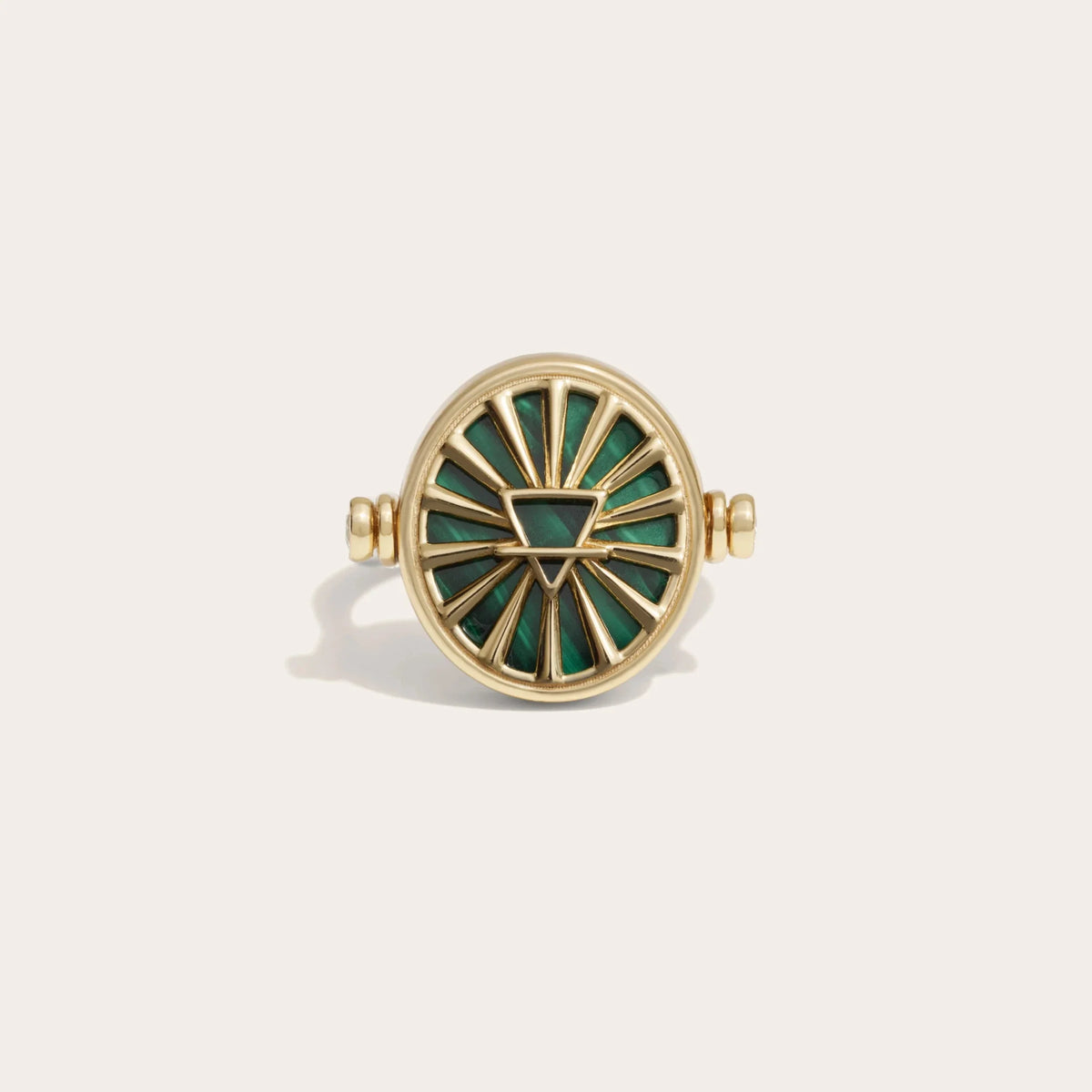 This ring is crafted from 14k yellow gold vermeil and features white topaz and malachite gemstones. It is double-sided and measures 18.1mm L x 21.3mm W.
