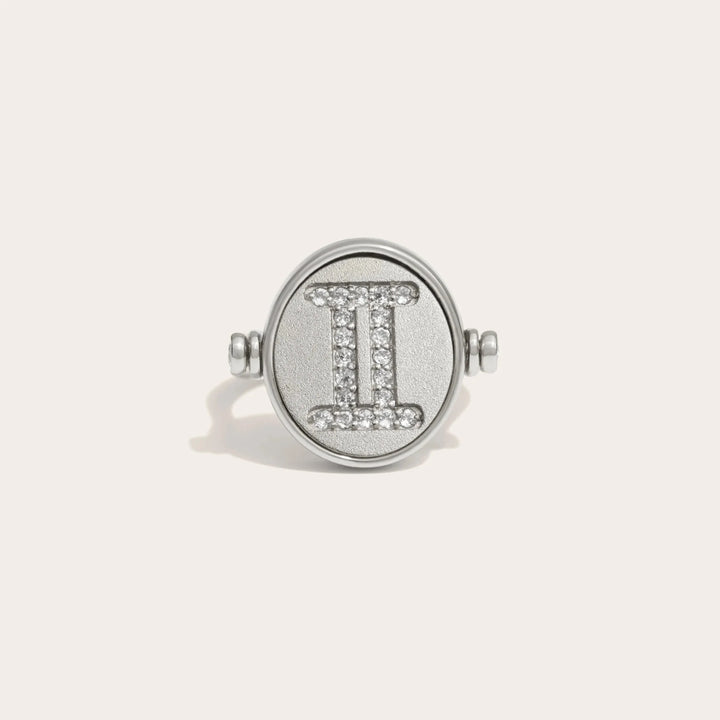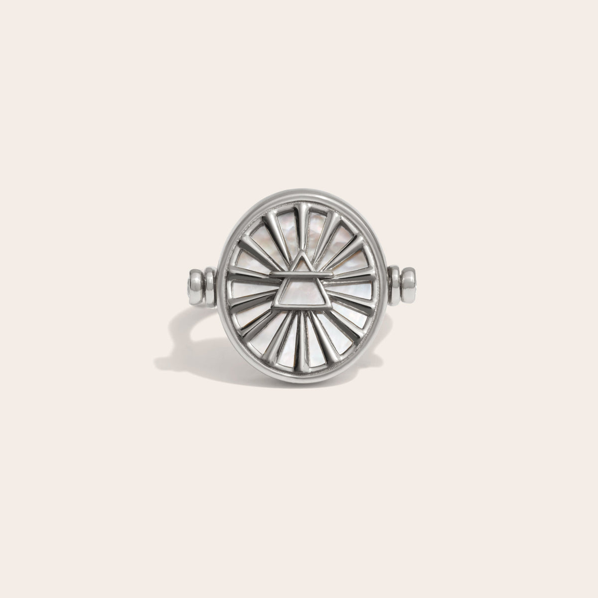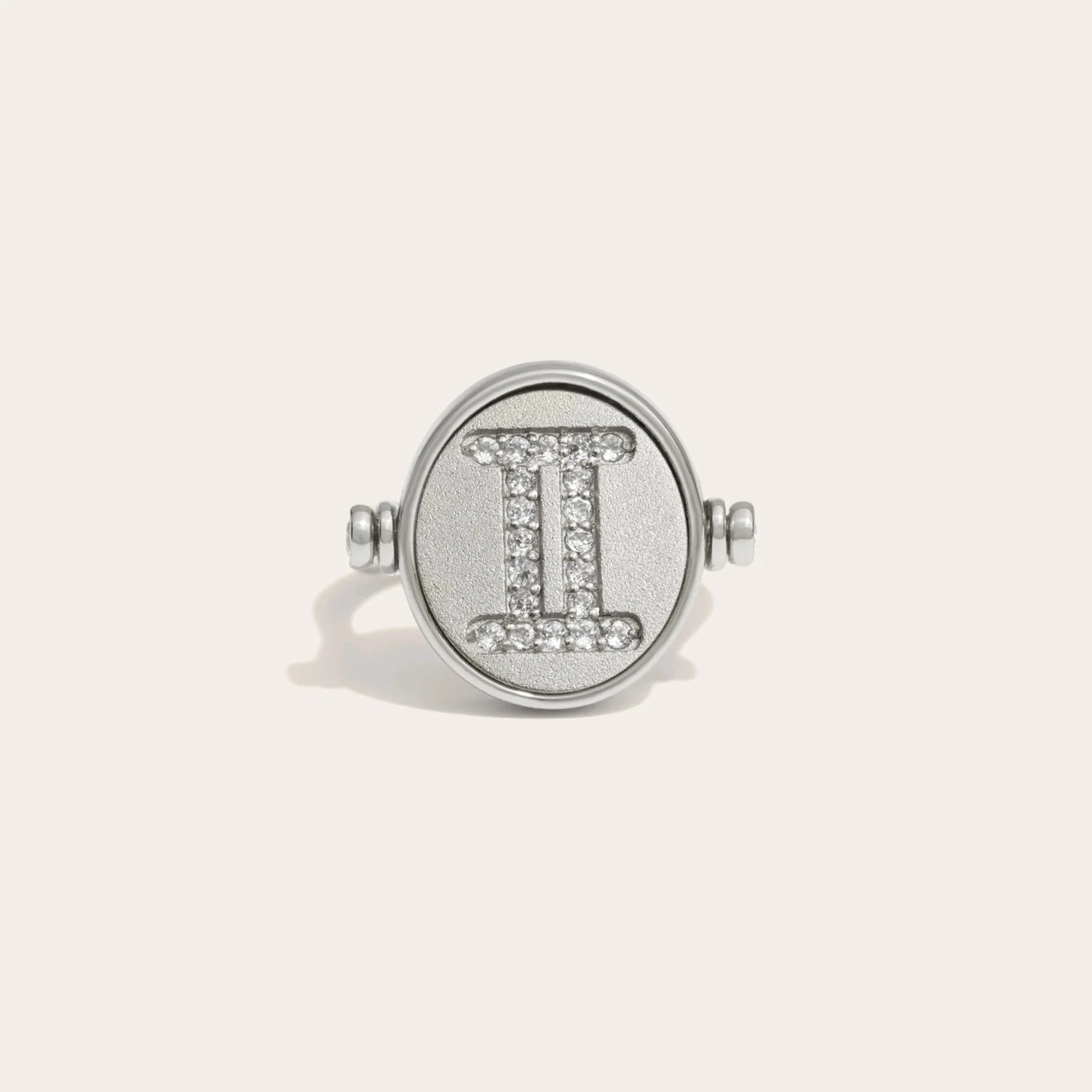 The Gemini & Air Flip Ring by Awe Inspired is a dynamic and symbolic accessory for those who identify with the Gemini zodiac sign or the air element. This double-sided flip ring is hinged and fully dynamic, allowing you to wear it on either side. One side features a mother of pearl inlay and the air element symbol, while the other shows the white topaz Gemini zodiac sign. It is a perfect piece to showcase your calm, ephemeral, and clever nature.