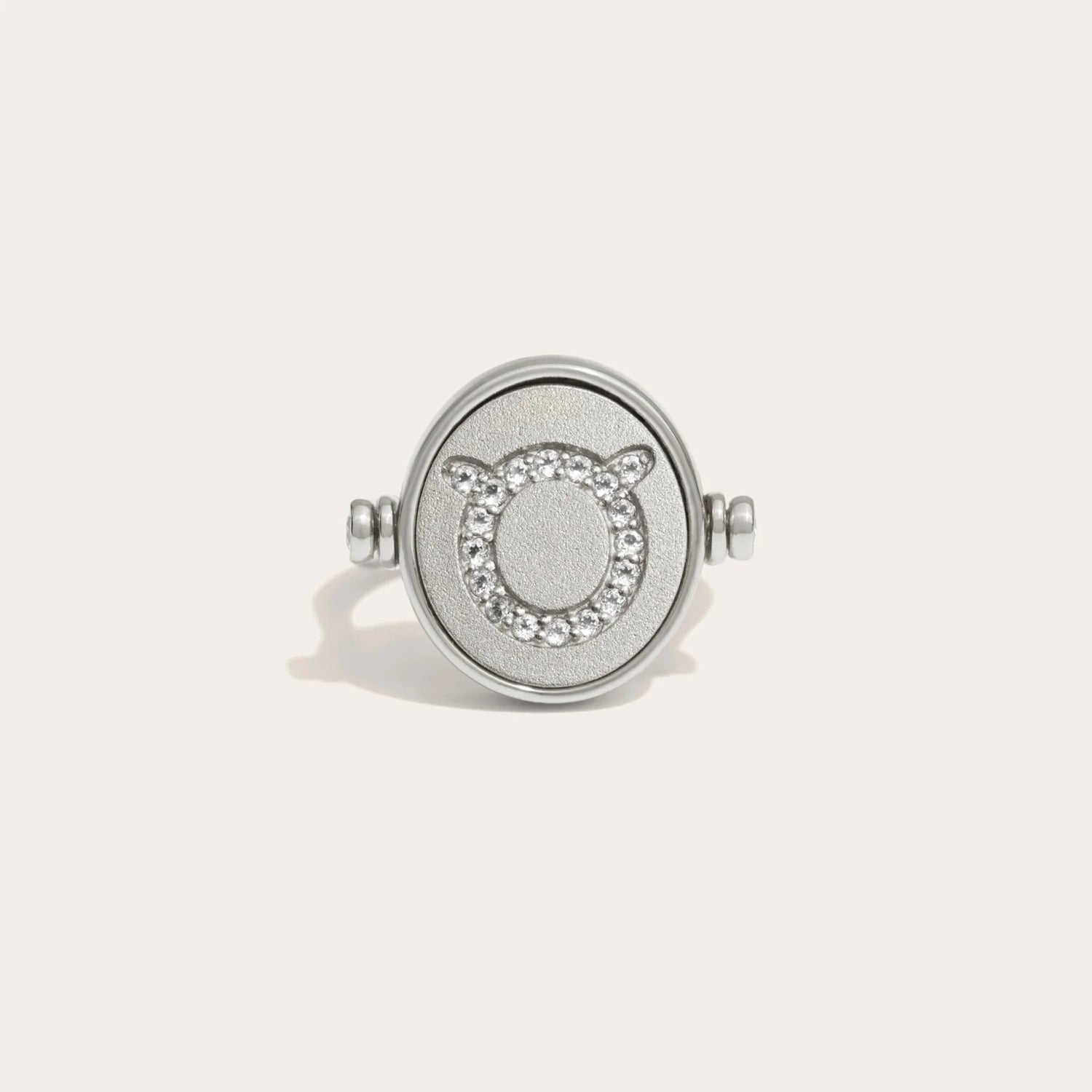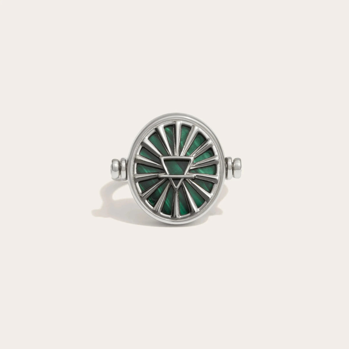 The Taurus & Earth Flip Ring by Awe Inspired is a grounded and balanced accessory for those who identify with the Taurus zodiac sign or the earth element. This double-sided flip ring is hinged and fully dynamic, allowing you to wear it on either side. One side features a malachite inlay and the earth element symbol, while the other shows the white topaz Taurus zodiac sign. It is a perfect piece to showcase your grounded, trustworthy, and balanced nature.