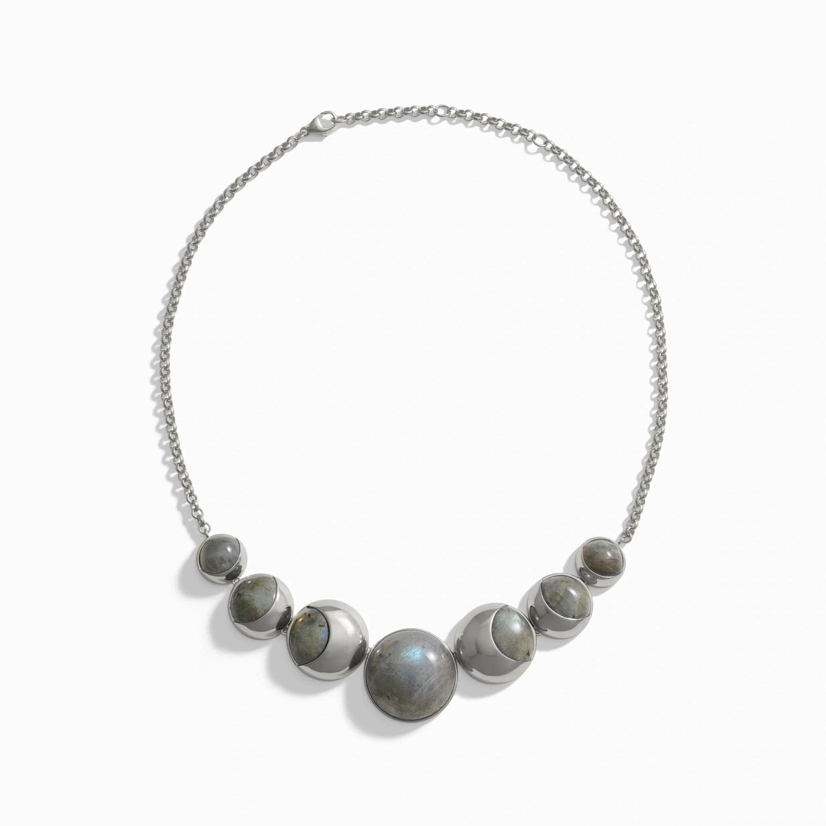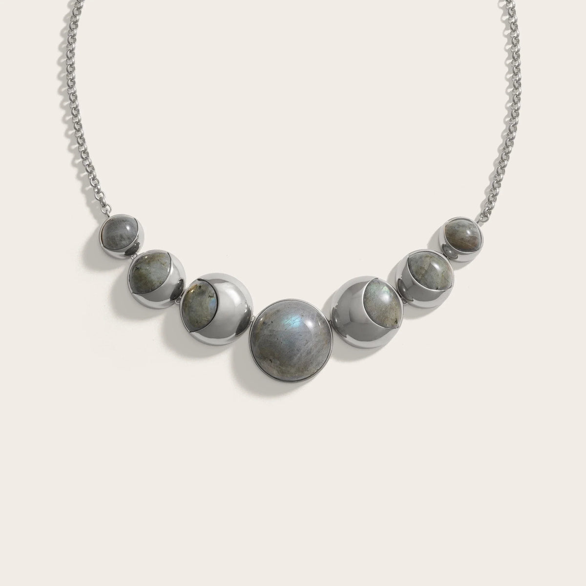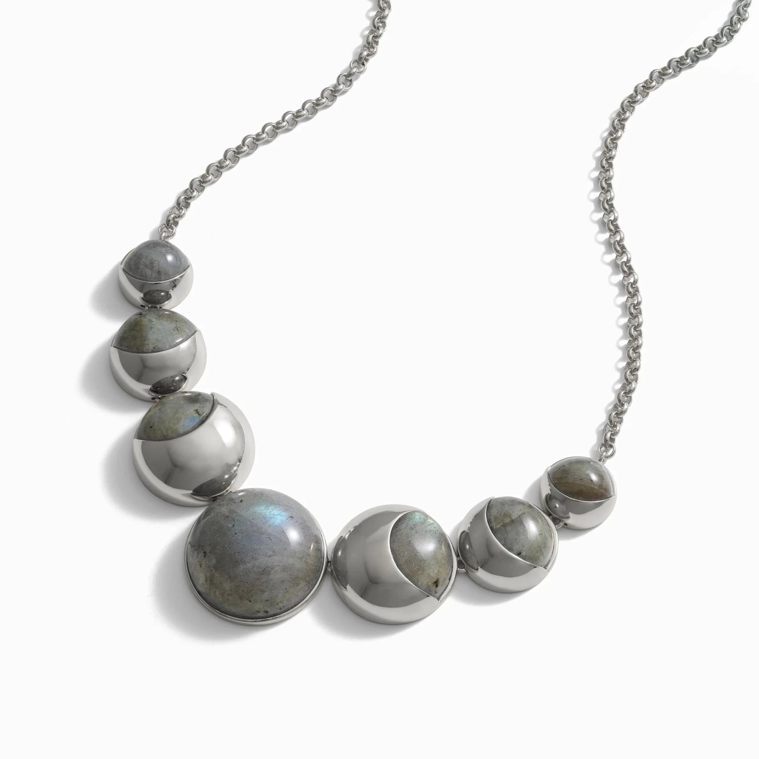 This Labradorite Moon Phase Statement Necklace by Awe Inspired is a celestial and spiritual piece inspired by the lunar cycle. It features a chain of labradorite gemstones, each representing a different moon phase and symbolizing the various phases of our lives. Labradorite, a gemstone of truth and transformation, illuminates your journey through these phases. This necklace is a powerful and beautiful reminder of personal growth and the constant cycles of life.