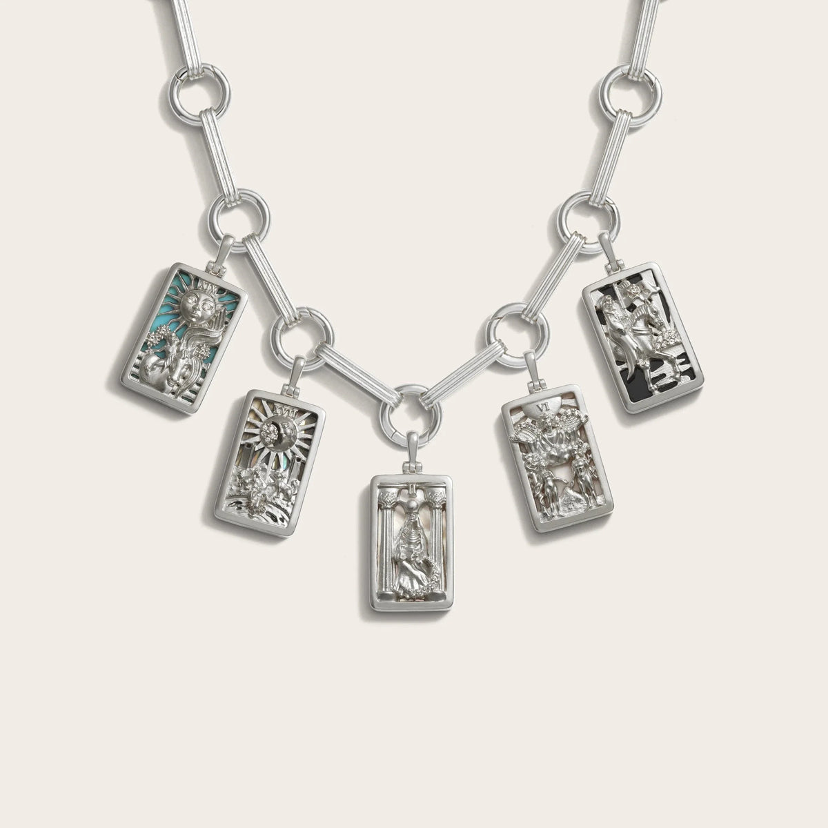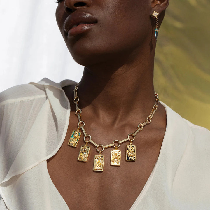 This Tarot Bar Charm Necklace by Awe Inspired is a powerful and magical accessory that combines five tarot card pendants on a bar collector necklace. The set includes: the Moon tarot card (abalone) for intuition and transformation, the Death card (onyx) for new beginnings, the High Priestess card (mother of pearl) for inner knowing, the Sun card (turquoise) for joy and success, and the Lovers card (pink mother of pearl) for divine union and love. This necklace ensures you're prepared with the knowledge of the cards by your side.