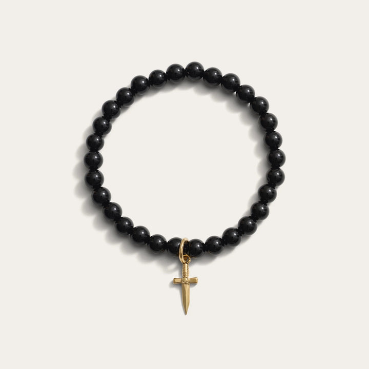 This bracelet is crafted from 14k yellow gold vermeil and features a black onyx gemstone. The beads are 6mm, and the amulet measures 16.5mm L x 7.8mm W.
