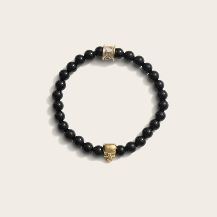 This bracelet is crafted from 14k yellow gold vermeil and features a black onyx gemstone. The beads are 6mm, and the amulet measures 10.4mm L x 7.5mm W.