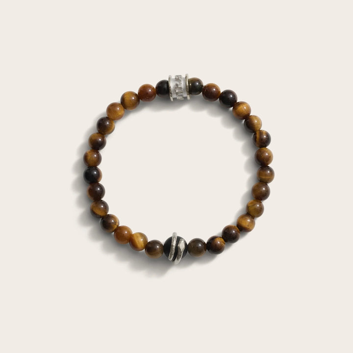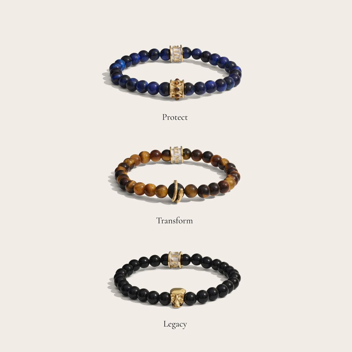 The Affirmation Bracelet by Awe Inspired is a daily emblem of strength, transformation, and legacy. Each bracelet features hand-cut gemstone beads and an amulet on one side and an affirmation inscribed on the other. You can choose your path: "Protect" with blue tiger's eye and the third eye; "Legacy" with black onyx and a skull; or "Transform" with tiger's eye and a snake. Each option is a powerful reminder of your inner strength and evolution.
