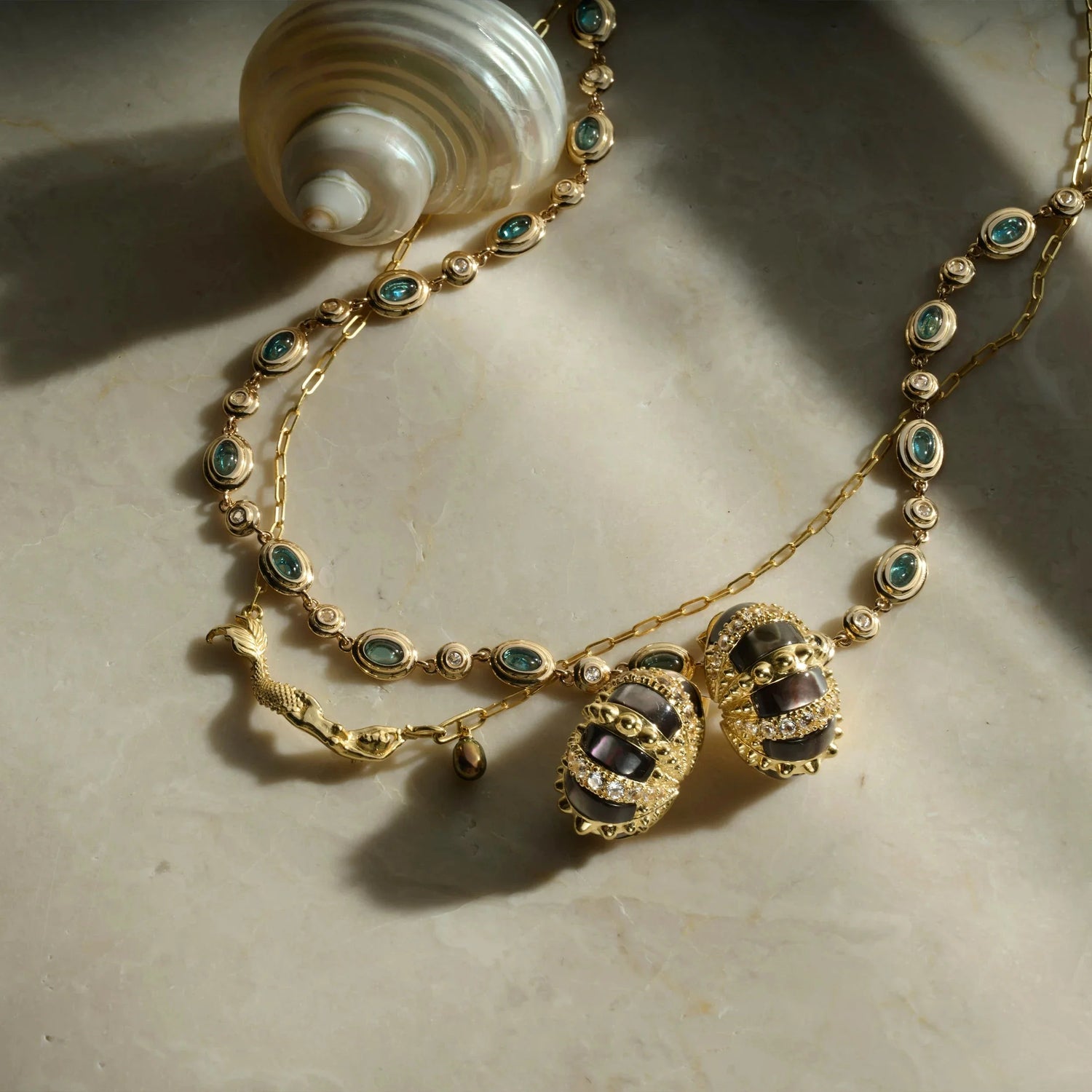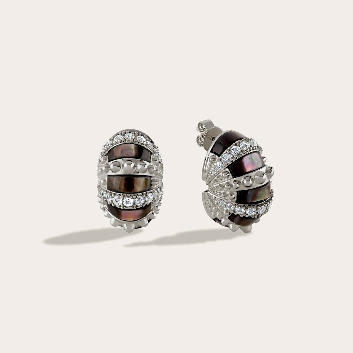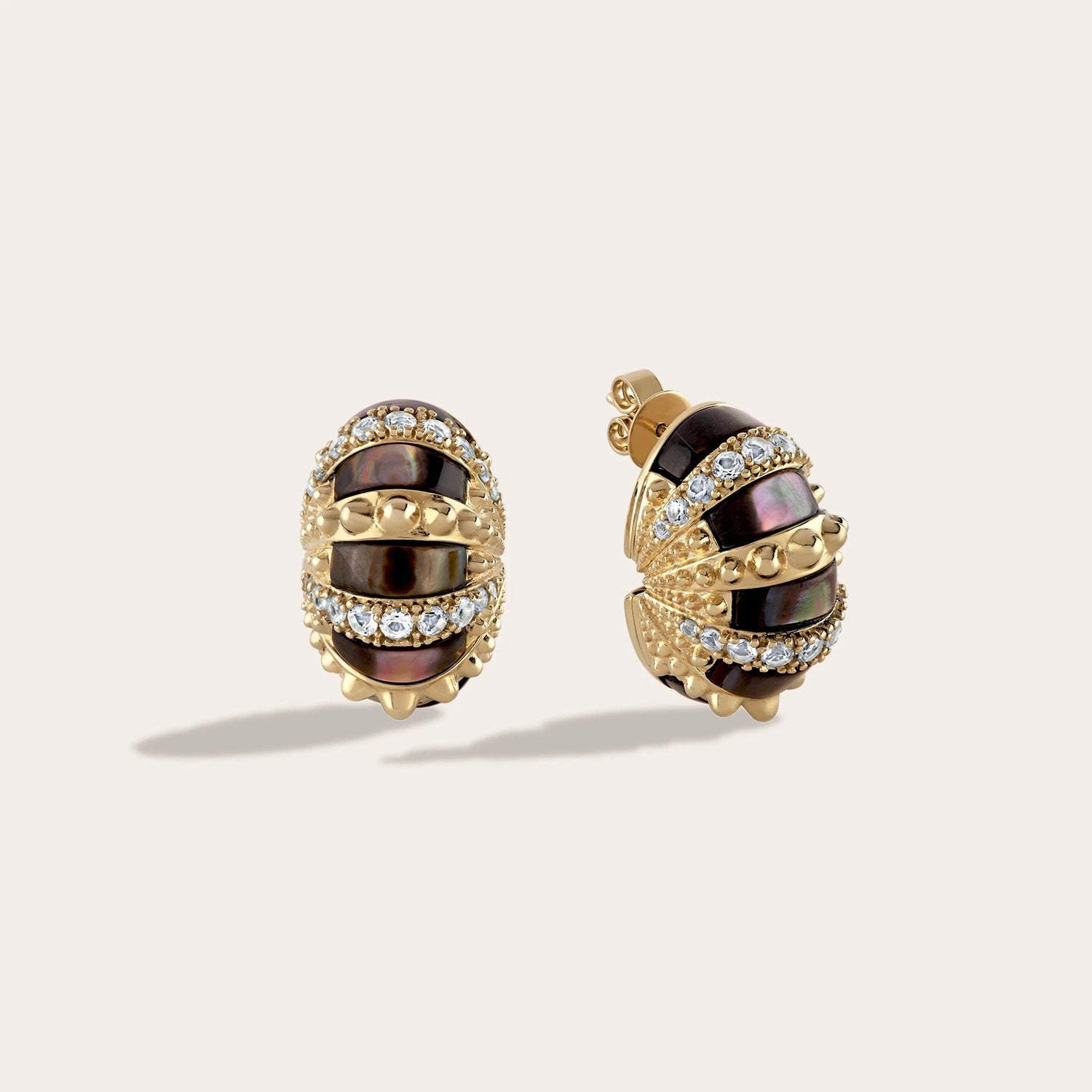 The Sea Urchin Statement Studs by Awe Inspired are bold earrings inspired by the sea urchin—a symbol of strength and protection. The studs feature black mother of pearl and white topaz, with bold gold detailing. They reflect the ocean's layered nature and the contrast of softness and strength, symbolizing beauty born under pressure. The earrings are secured with extra-strong backs.