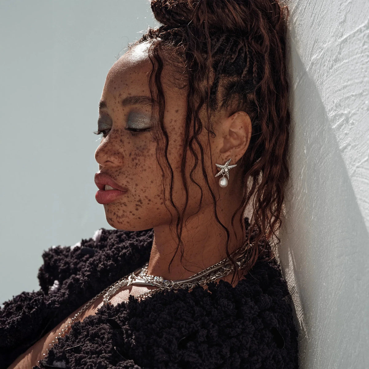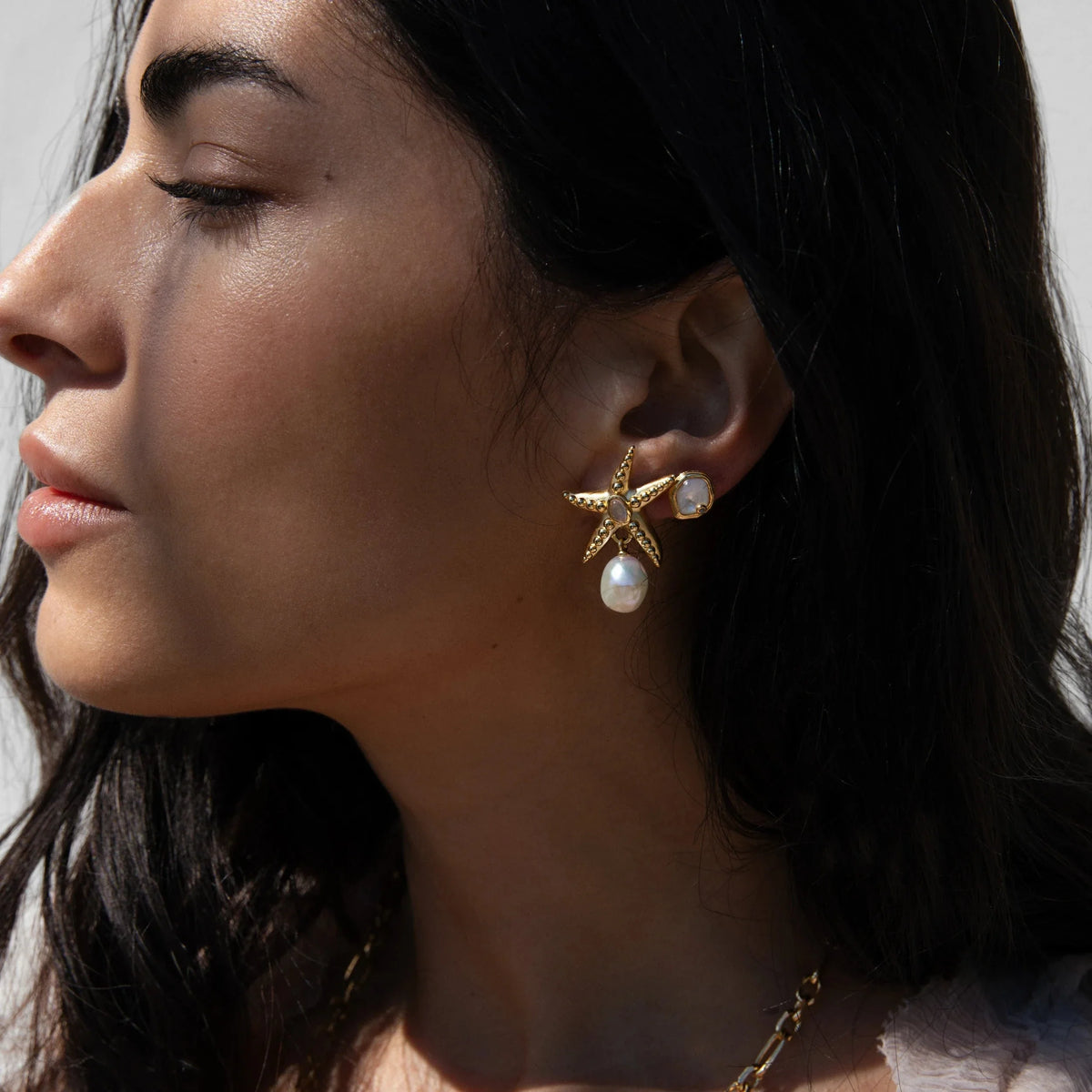 The Starfish Pearl Earrings by Awe Inspired are sculptural earrings that symbolize regeneration and intuition. They feature moonstone-adorned starfish atop organic drop pearls. Their asymmetrical design evokes the unpredictable rhythm of the ocean and celebrates the beauty that comes from imperfection.