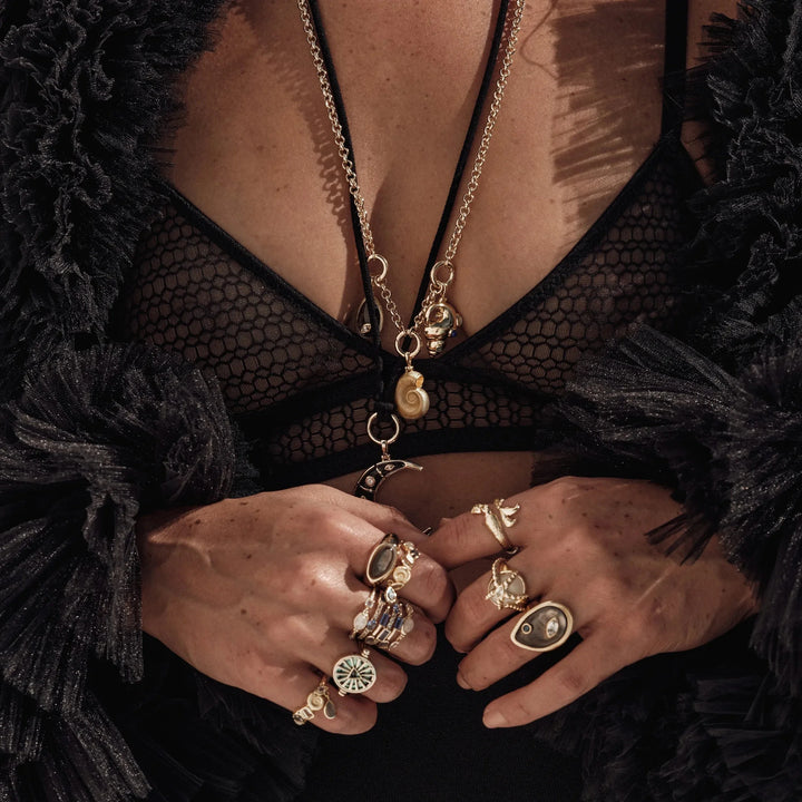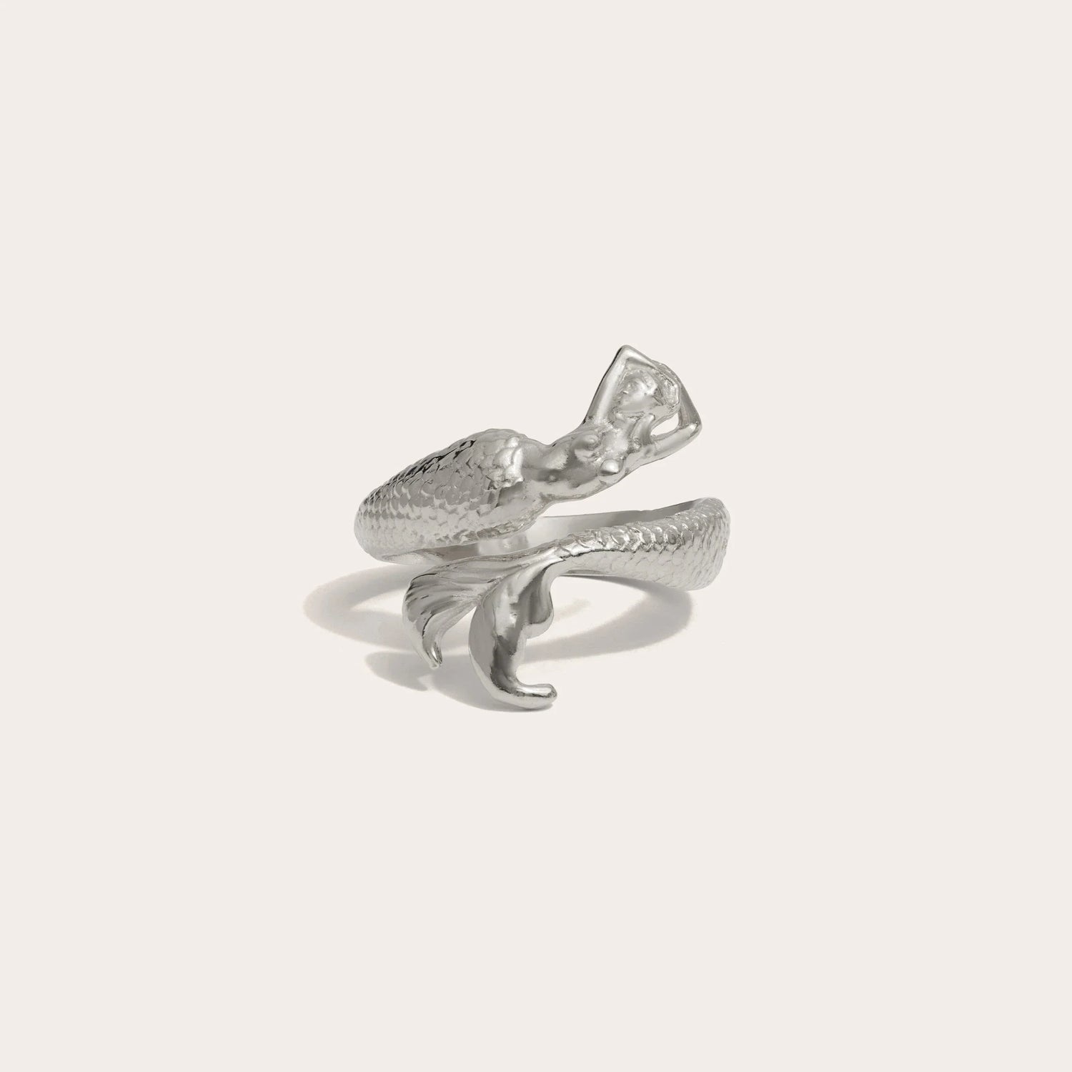 The Sea Siren Ring by Awe Inspired captures the dangerous beauty of the ocean. It features a sea siren wrapped around the finger, with her body arched and tail curled to create a sculptural band. Her dark seduction invites you into the depths. This piece is a symbol of untamed allure and mystery.