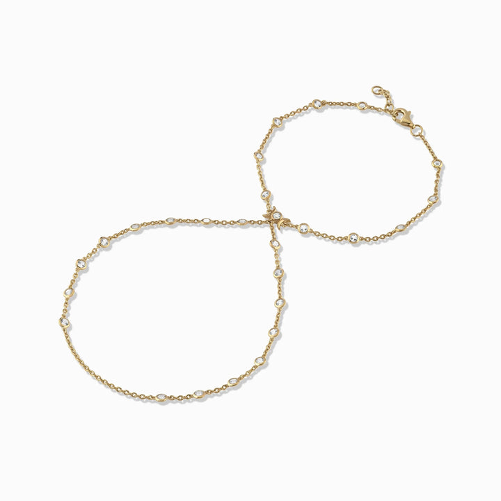 This hand chain is crafted from 14k yellow gold vermeil and features white topaz gemstones. The drop from wrist to finger is 8.5", and the length is 6.25" with a 1" extender.