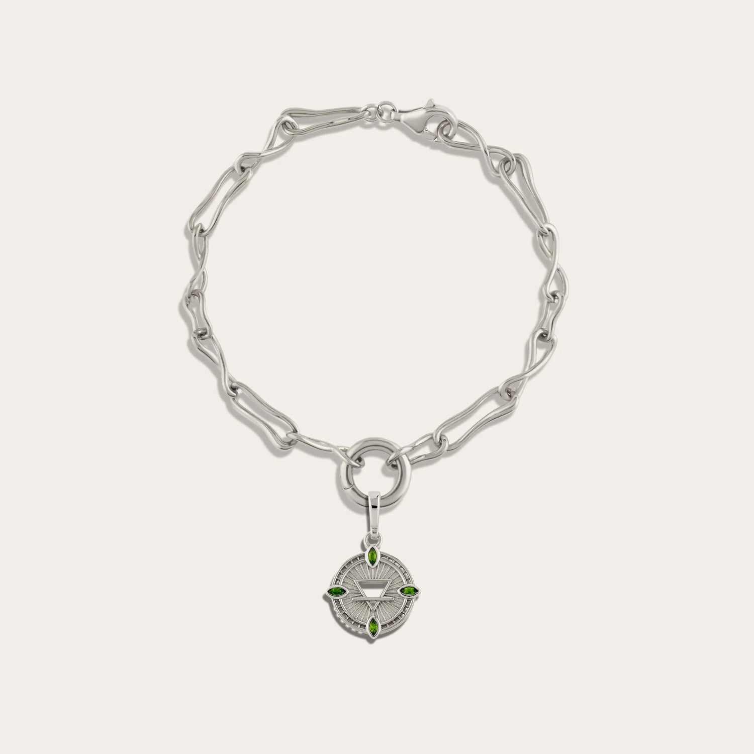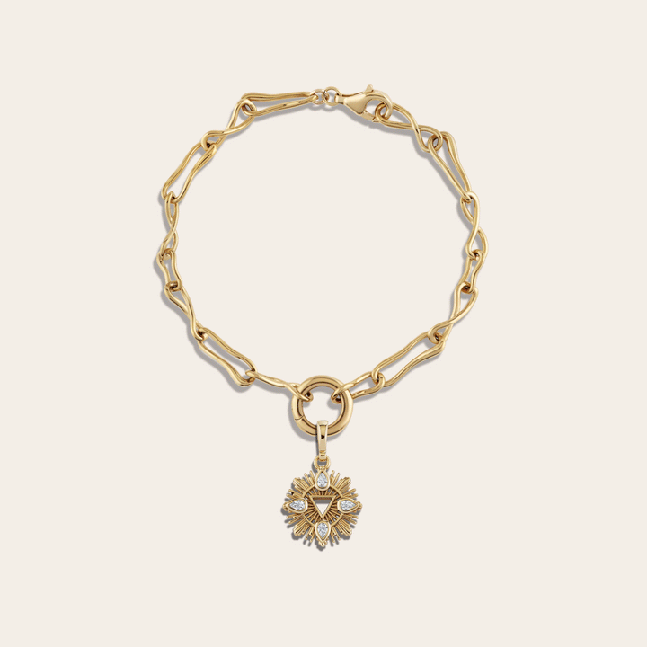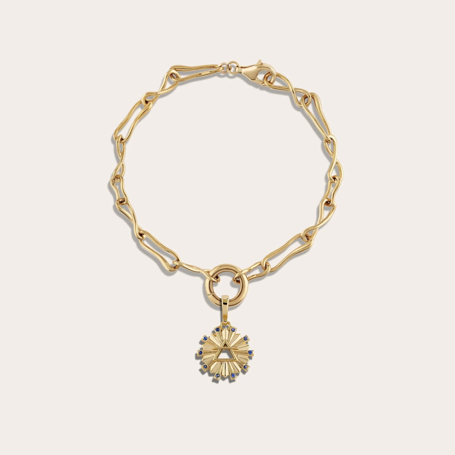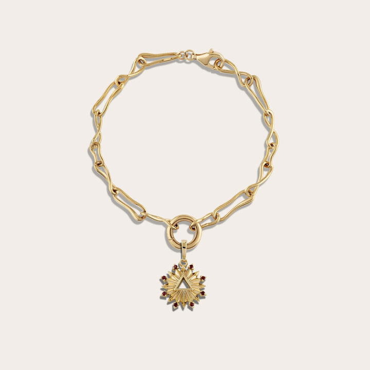 This bracelet is crafted from 14k yellow gold vermeil and features a sky blue topaz gemstone. The Mini Air Element Amulet measures 15mm L x 15mm W and comes on a Molten Chain Bracelet.