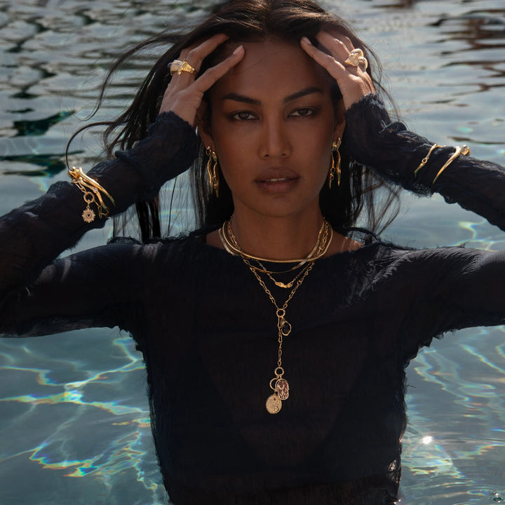 This Molten Element Bracelet by Awe Inspired is a unique piece that channels the energy of the Air element. It features the Mini Air Element Amulet, which is adorned with a sky blue topaz for clarity and expansion. This bracelet is a subtle yet powerful talisman that allows you to stay aligned with your zodiac energy and the ever-flowing nature of life. It’s a stylish and meaningful accessory for daily wear.
