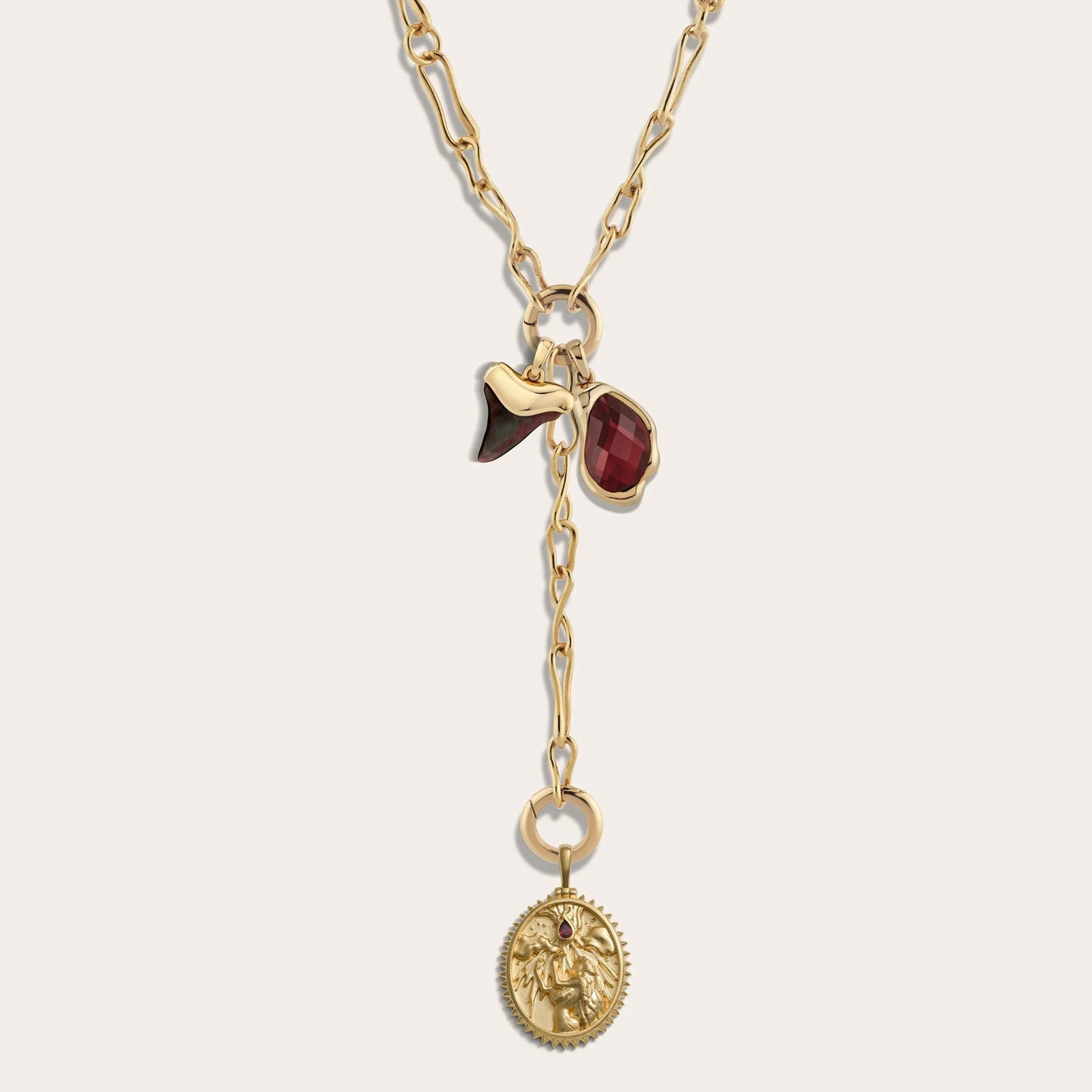 This necklace is crafted from 14k yellow gold vermeil and features garnet and black mother of pearl gemstones. The set includes the Pele Pendant, a Molten Gemstone, and a Shark Tooth on a 17" + 2" drop Y Necklace.
