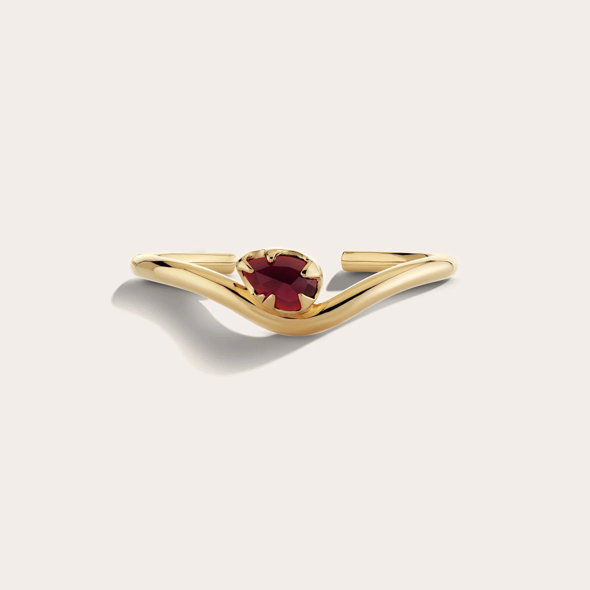 This Molten Statement Gemstone Cuff Bracelet by Awe Inspired is a sculptural piece that embodies the fire you carry within. The cuff wraps around the wrist in a flowing, molten wave, anchored by a dramatic, pear-shaped gemstone. Choose the deep red garnet for grounding passion, a stone known for its intense energy. This cuff is a bold symbol of raw, radiant life force, designed for the individual who isn't afraid to make a statement with their energy.