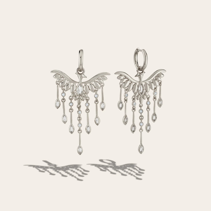 These Chandelier Phoenix Drop Earrings by Awe Inspired are a stunning reflection of transformation, resilience, and the strength to begin again. Set with brilliant white topaz, they catch the light beautifully, symbolizing the dazzling beauty of rebirth. These earrings are a powerful reminder of what it means to break, to rebuild, and to become whole again. They are a statement of your inner fire and your capacity for renewal.