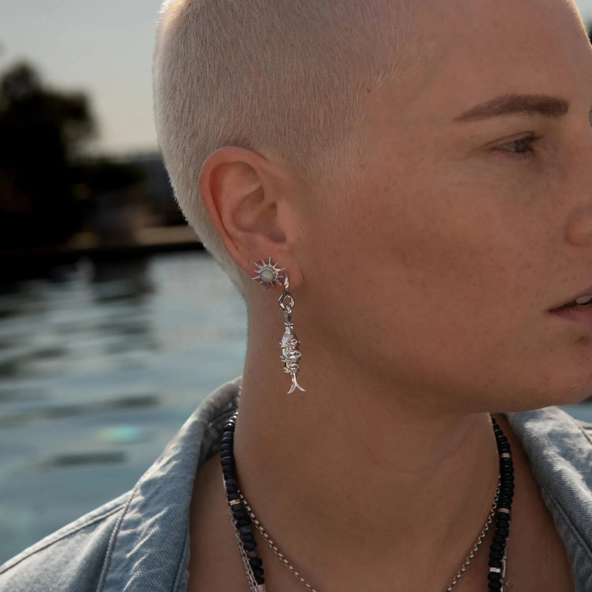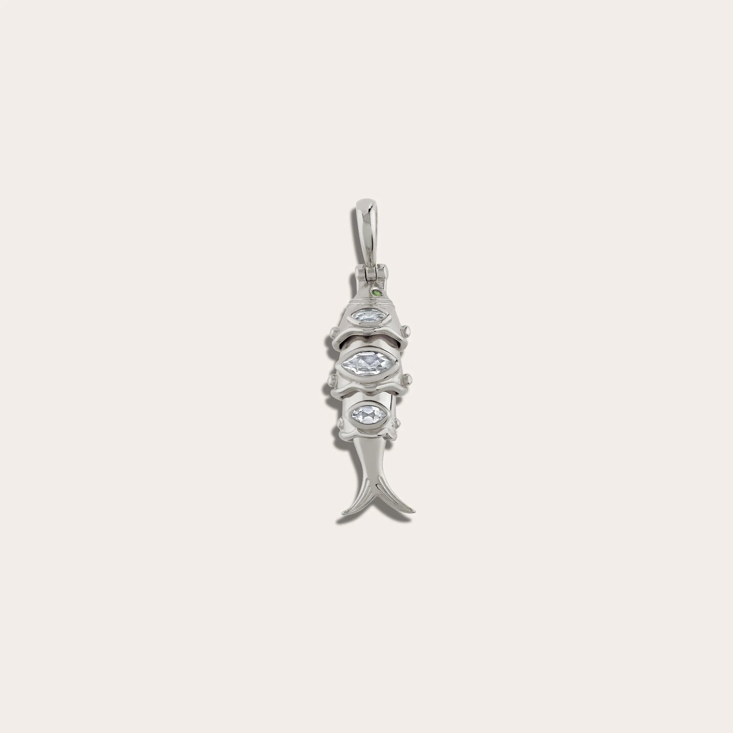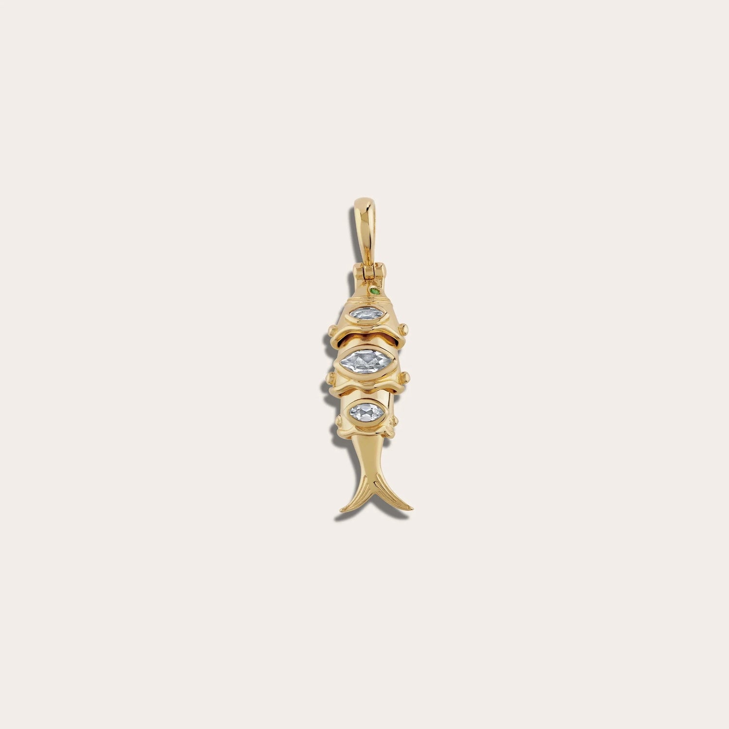 Style Notes: This Lucky Fish Pendant by Awe Inspired is a beautiful and functional piece made to bring luck. The articulated body of the fish features a diopside eye and marquise-cut white topaz accents. Its segmented body moves with a touch, offering a subtle, meditative tactile experience. Fish are a symbol of abundance and plenty, a lucky symbol across all coastal cultures. This elegant piece is a daily talisman for attracting all you desire.