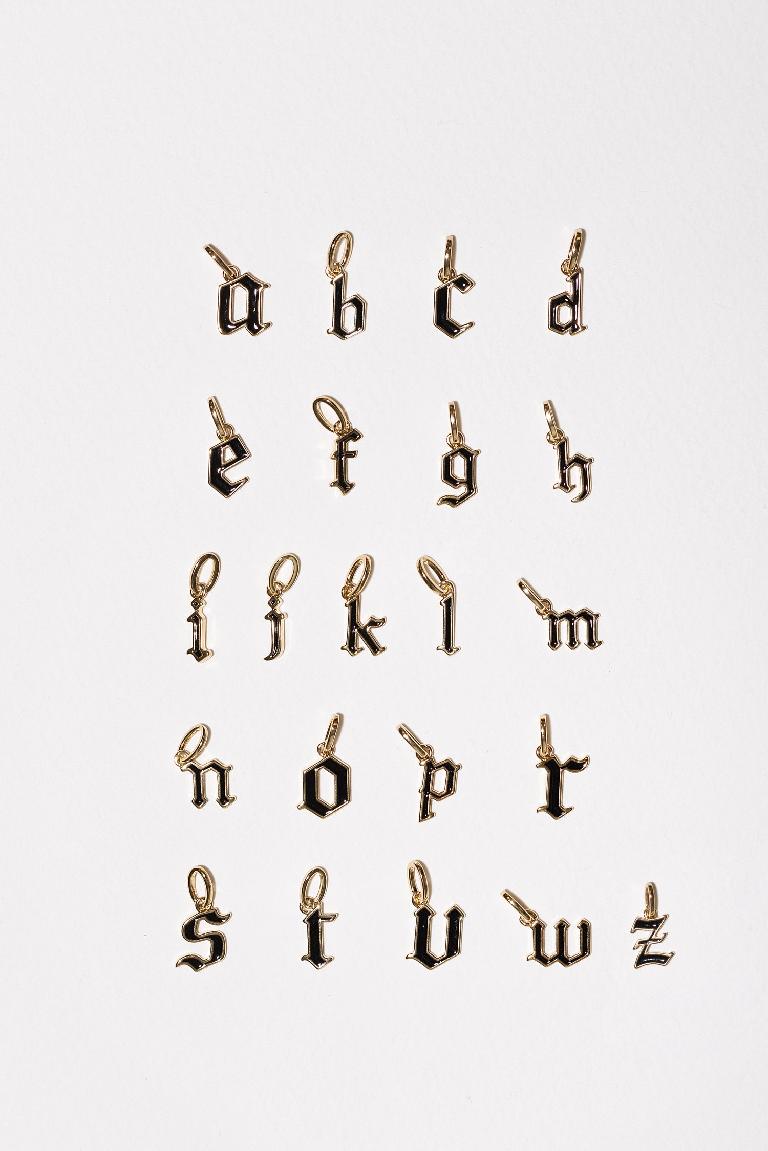 Made of 18k gold-plated brass with black enamel. Measures 11mm in height (width varies by letter). Letters Q, U, X, and Y not available.