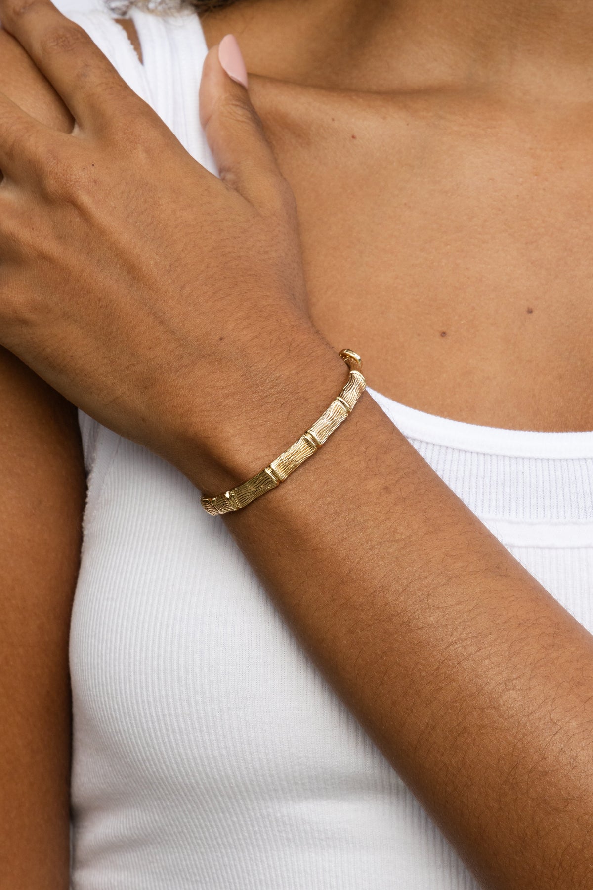 18k gold-plated brass with a 6mm thick band and bamboo texture. Sizes: XS (up to 5.5”), S (5.75”–6.25”), M (6.5”–7”), L (7.25”–7.75”), XL (8”–8.5”).