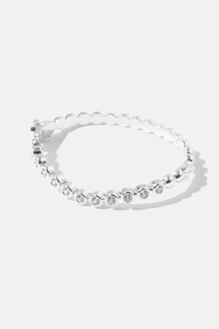 Handcrafted in sterling silver-plated brass with bezel-set cubic zirconia stones. Cuff width: 5mm. Available in XS (fits wrist up to 5.5”), S (5.75”–6.25”), M (6.5”–7”), L (7.25”–7.75”), XL (8”–8.5”).