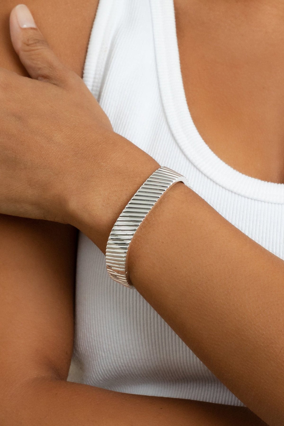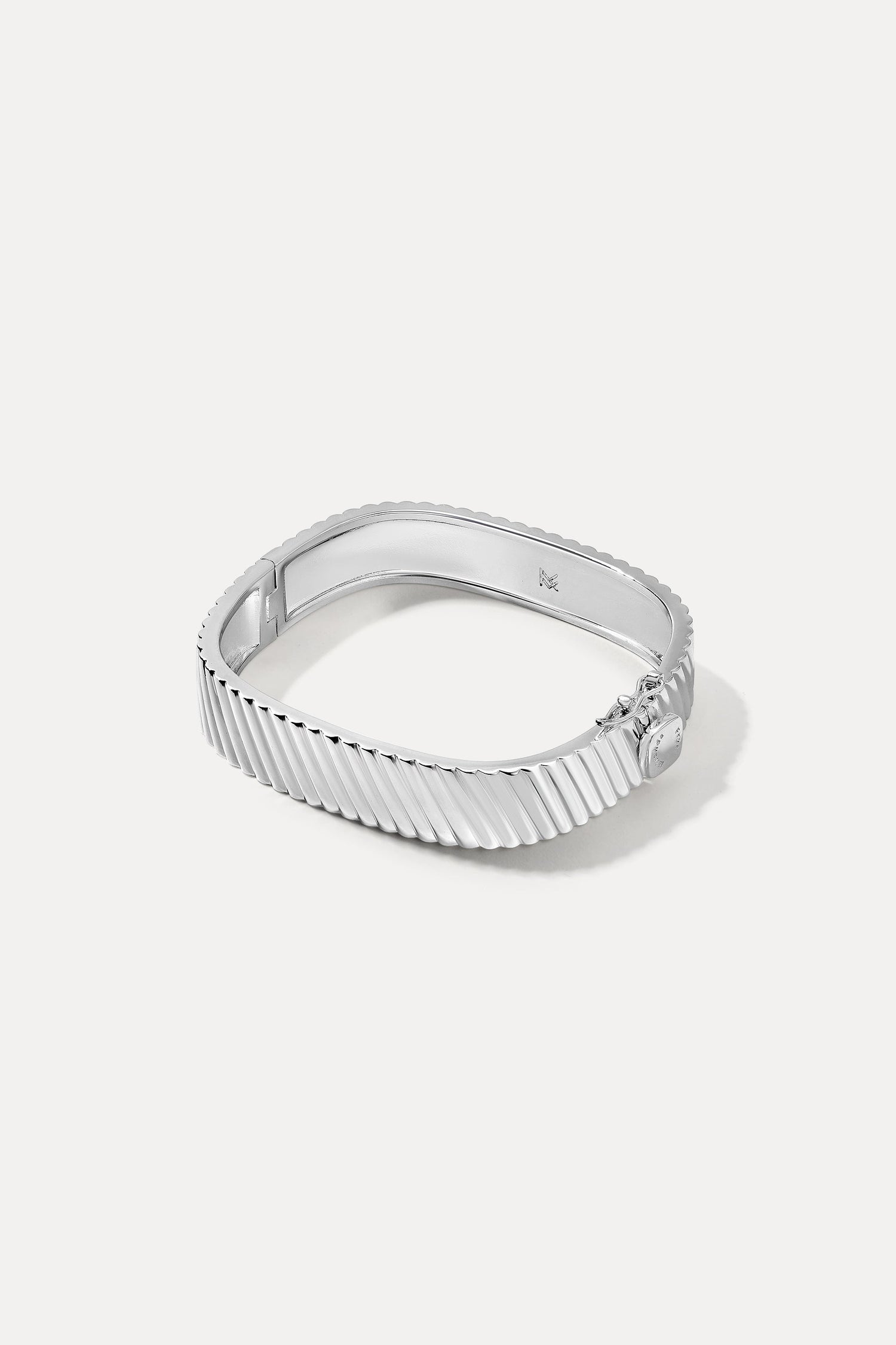 Handcrafted in sterling silver-plated brass. Width: 12mm. Available in XS (fits up to 6”), S (6”–6.5”), M (6.5”–7”), L (7”–7.5”).
