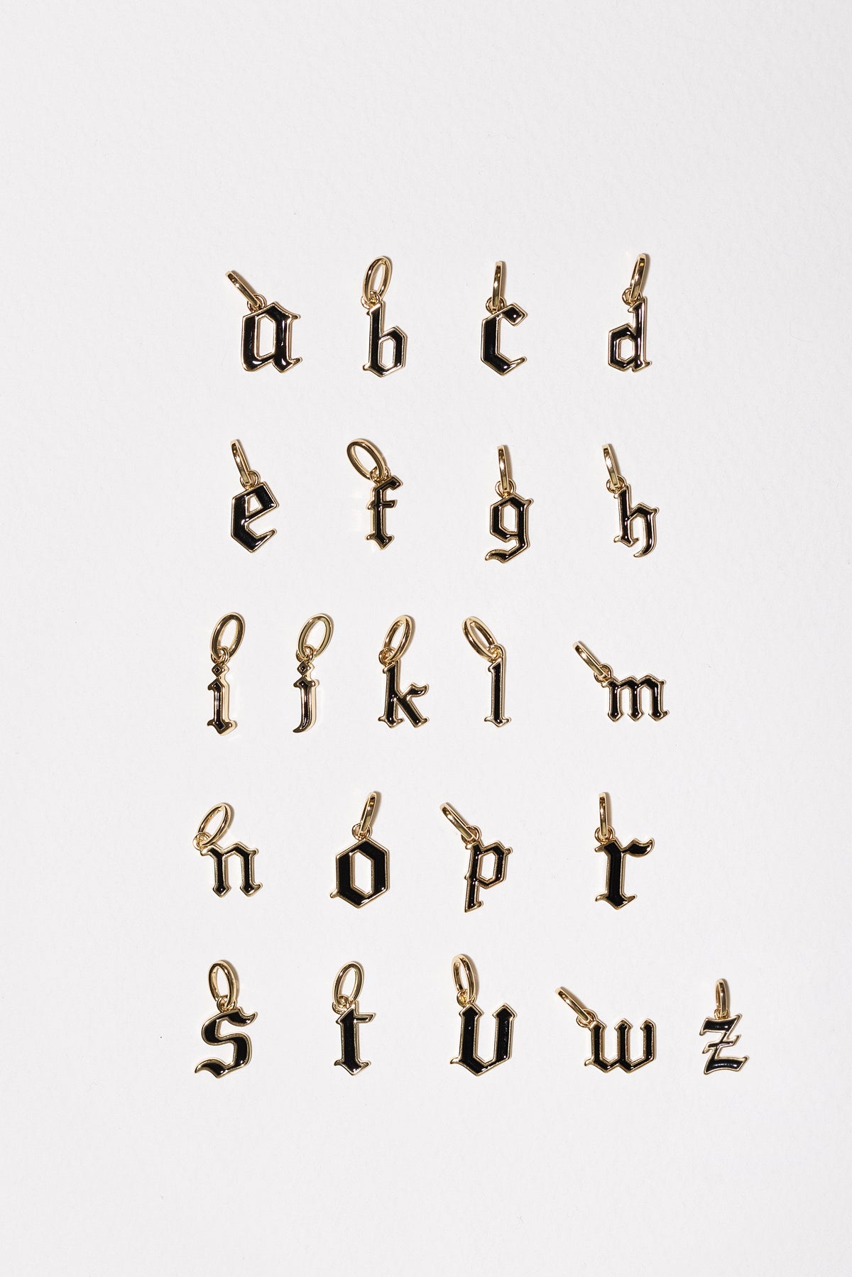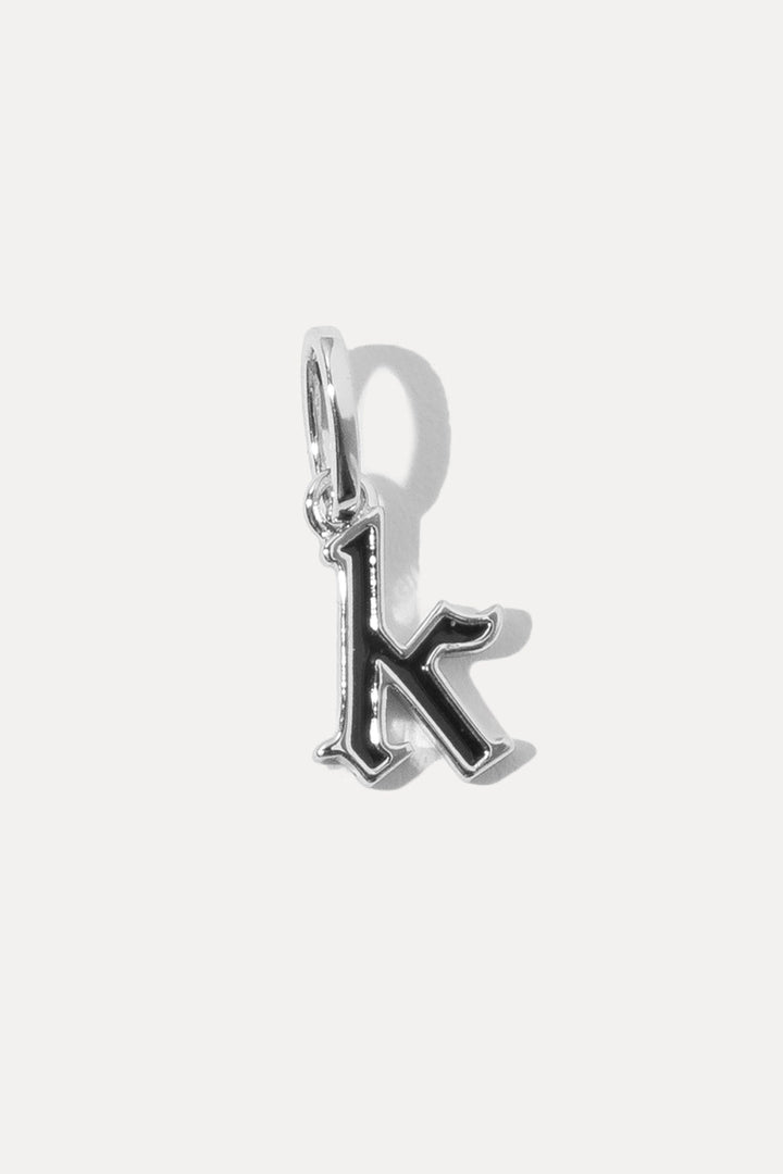 Made from sterling silver-plated brass with black enamel detailing. Measures 11mm in height; width varies by letter. Available in all letters except Q, U, X, Y.