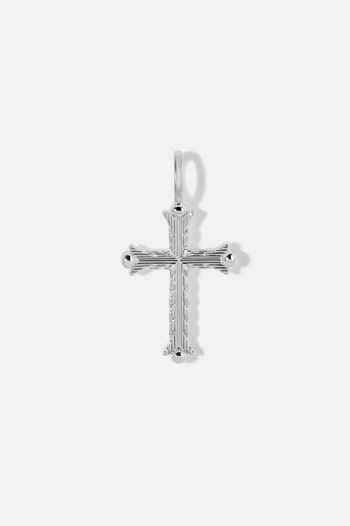 This Faith Charm by Miranda Frye is a powerful symbol of resilience and grace. Designed as a contemporary cross, it features intricate engravings and textured accents that add depth and dimension. A timeless token of strength and devotion, perfect for those who seek to carry meaning in their everyday layers.