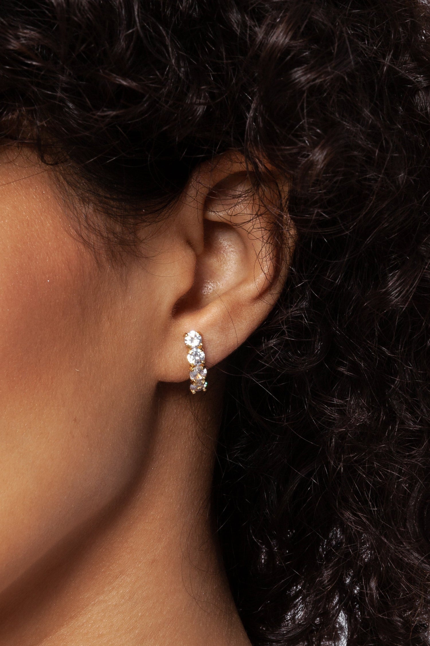 18k gold-plated brass with 4mm cubic zirconias. 1.5cm drop. Includes custom MF Earring Backs.