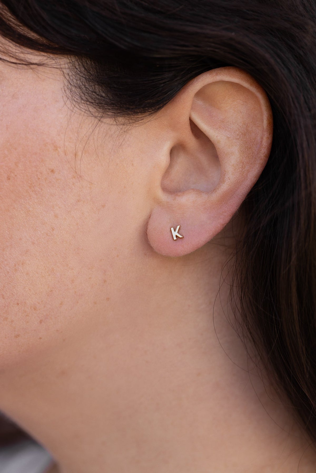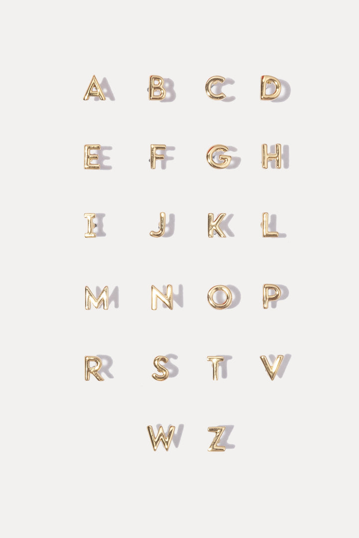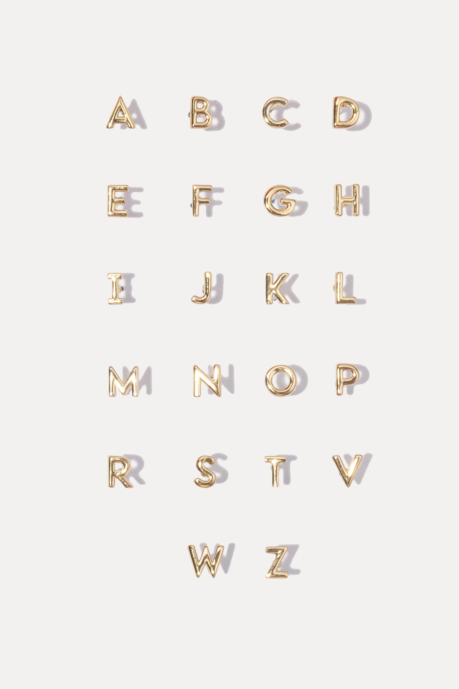 18k gold-plated brass. 4.5mm height, width varies by letter. Surgical stainless steel posts. Sold as a pair.
